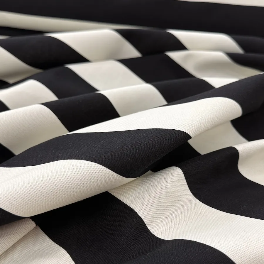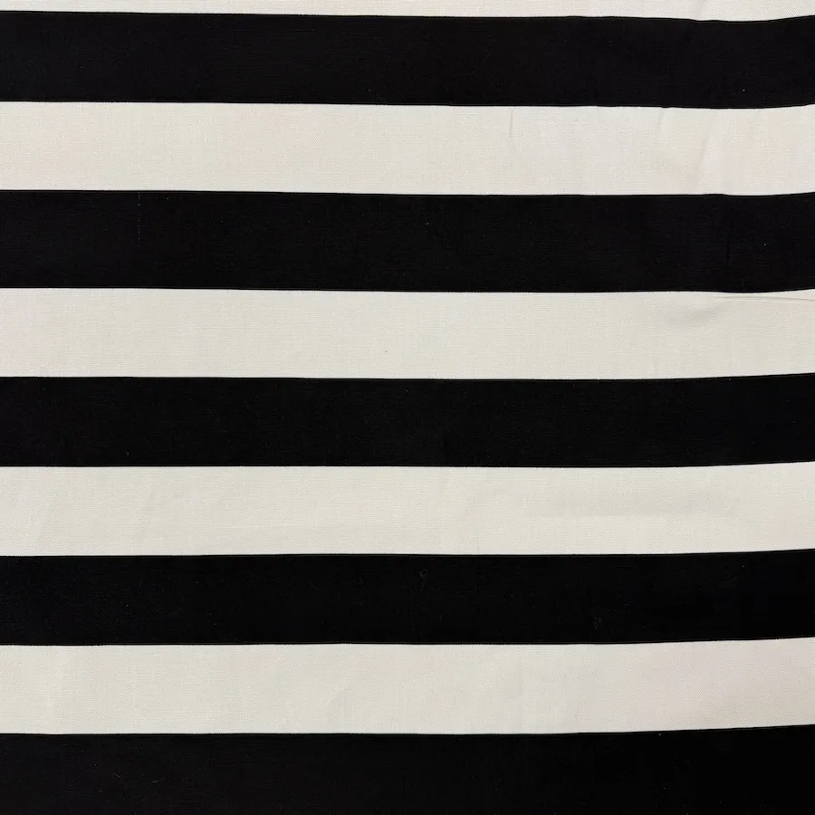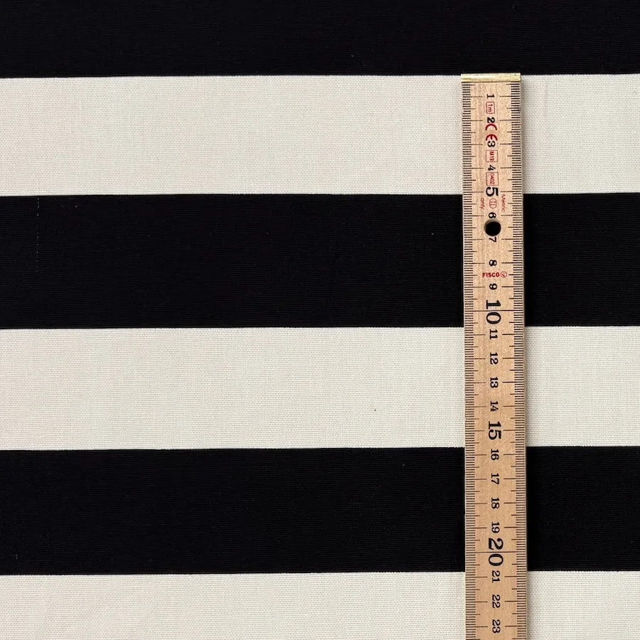 This wide, bold stripe in Black and Cream is printed onto beautiful quality 100% cotton canvas. It is idea for a range of projects – from jackets and trousers to bags and accessories.