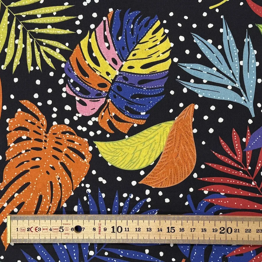 This smooth 100% cotton is printed with a vibrant foliage design in rainbow colours the pop against the black background.