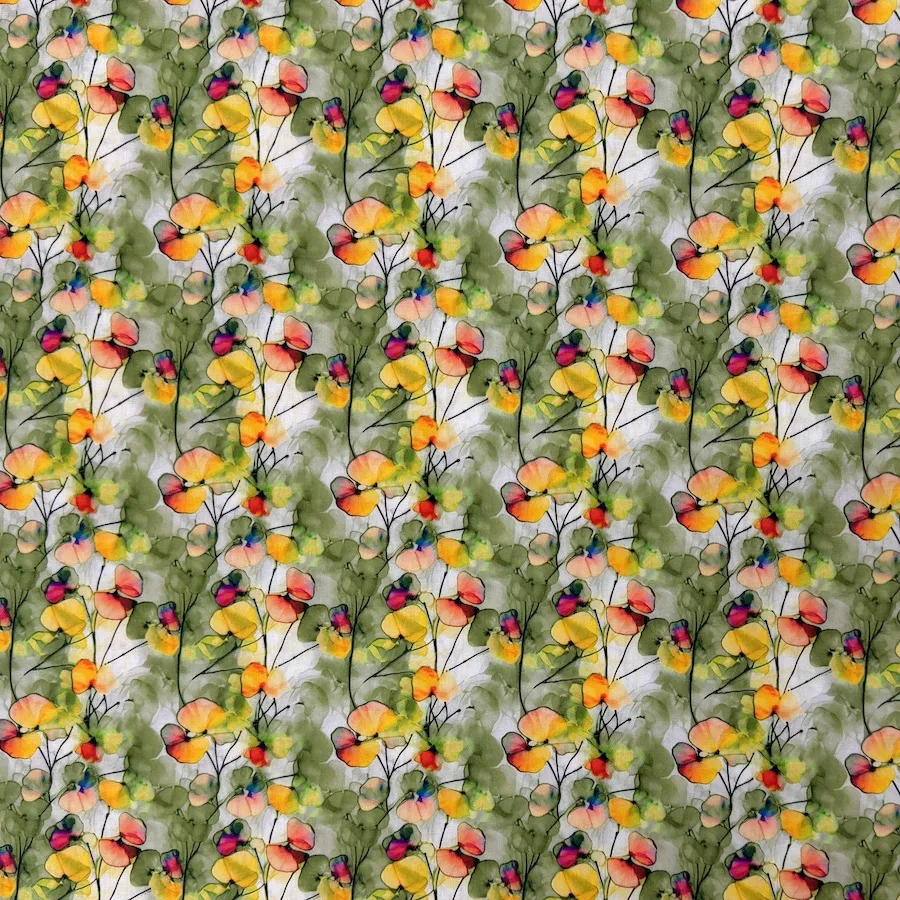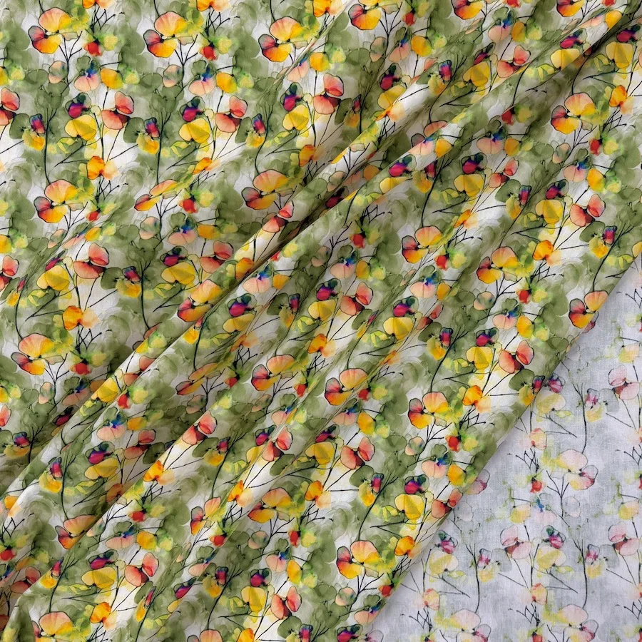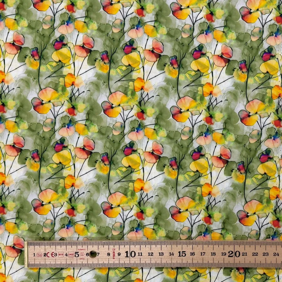 100% Cotton Poplin – Watercolour Flowers – Green/Yellow