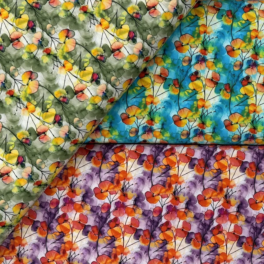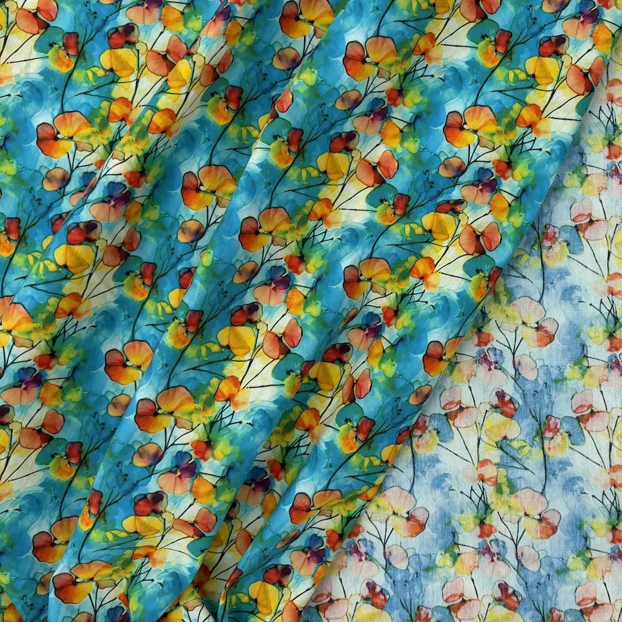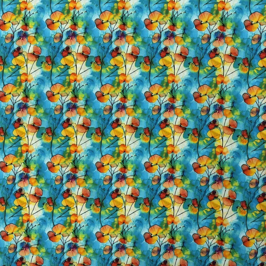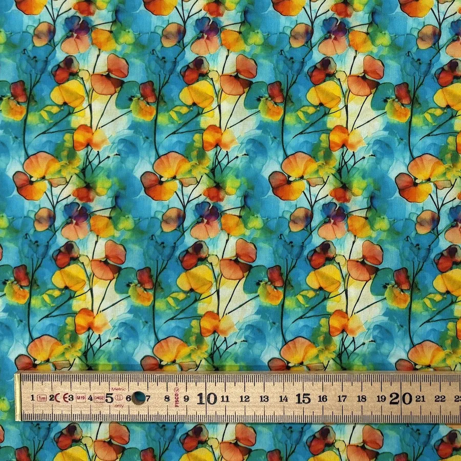 100% Cotton Poplin – Watercolour Flowers – Turquoise/Orange