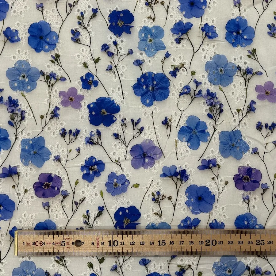 A beautiful lightweight 100% Cotton featuring a watercolour wildflower design over embroidered Broderie Anglaise.