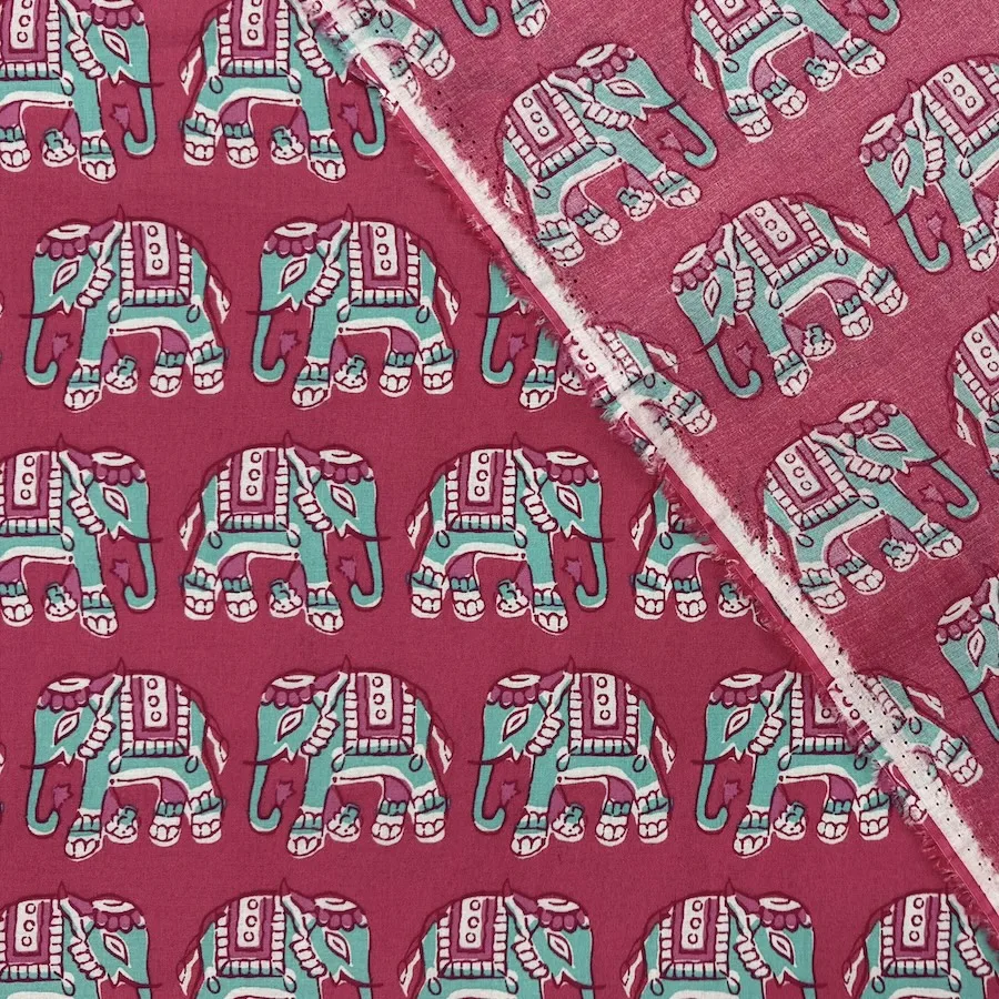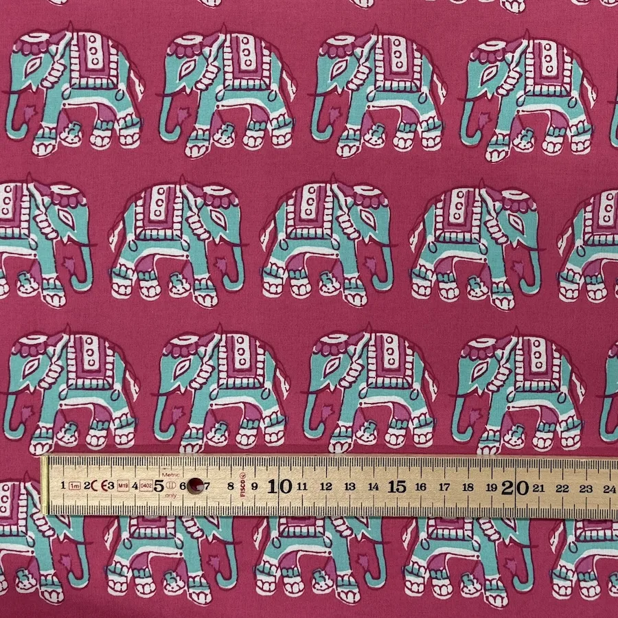 A beautiful lightweight 100% cotton voile fabric printed with marching aqua coloured elephants on a fuchsia background.