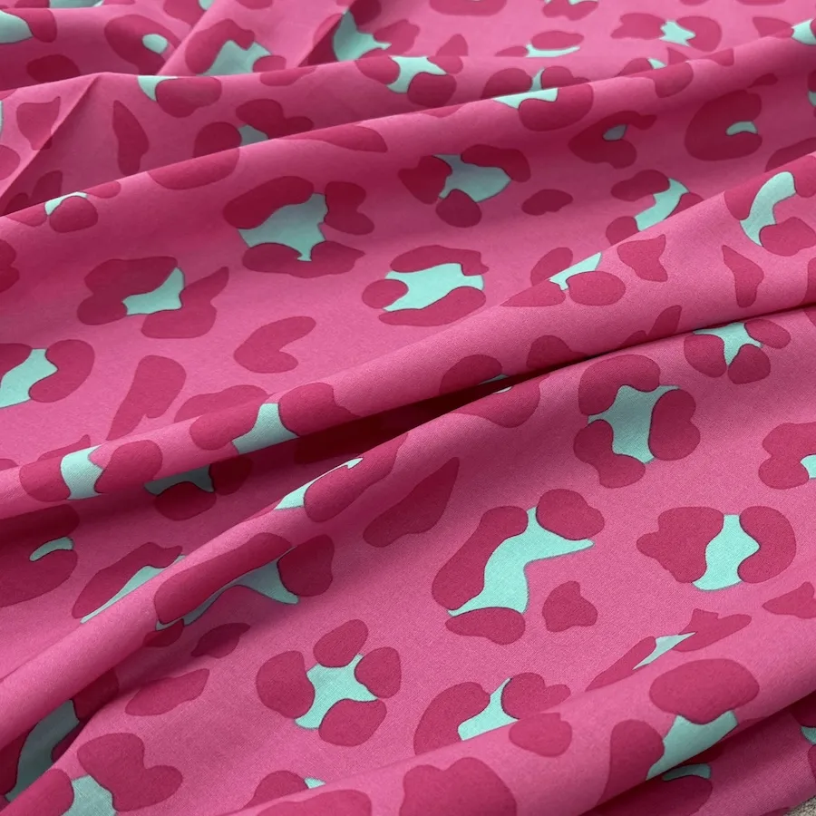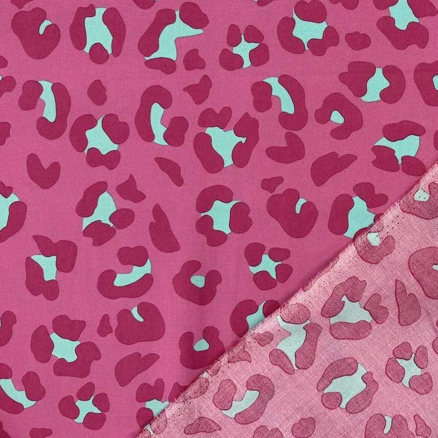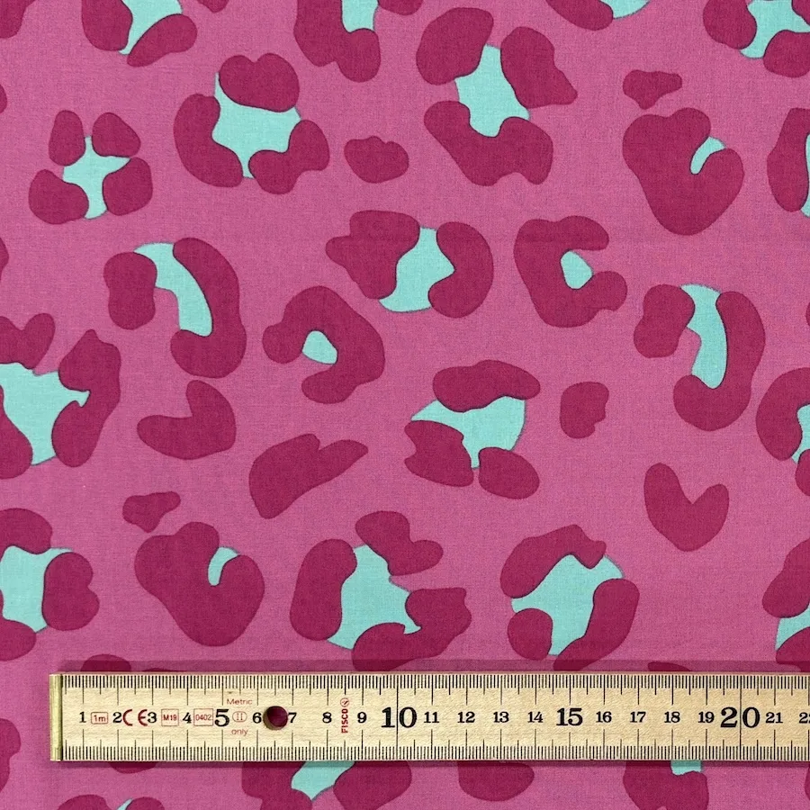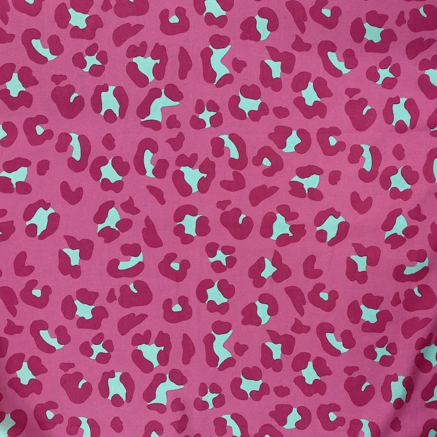 A beautiful lightweight 100% cotton voile fabric printed with a classic leopard skin design in fuchsia and aqua.