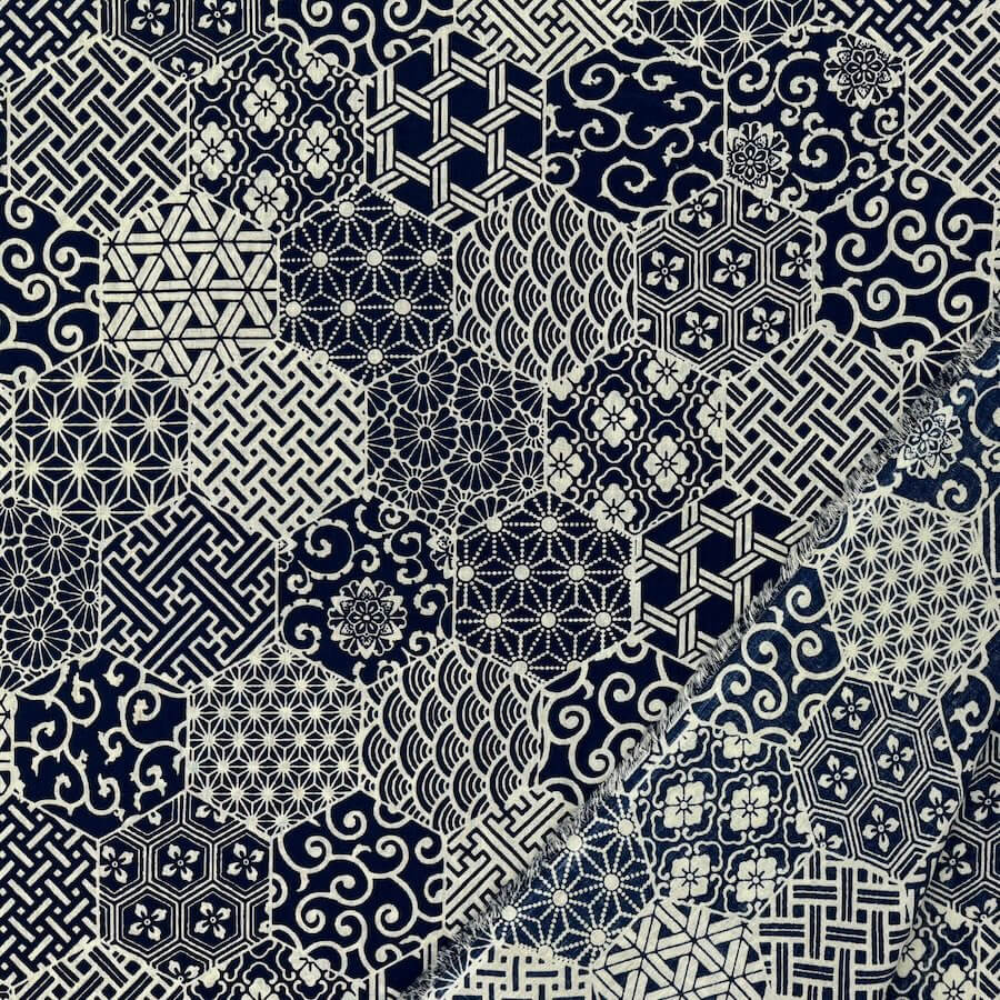 A beautiful lightweight 100% cotton voile fabric printed with hexagons filled with mini sashiko style patterns.