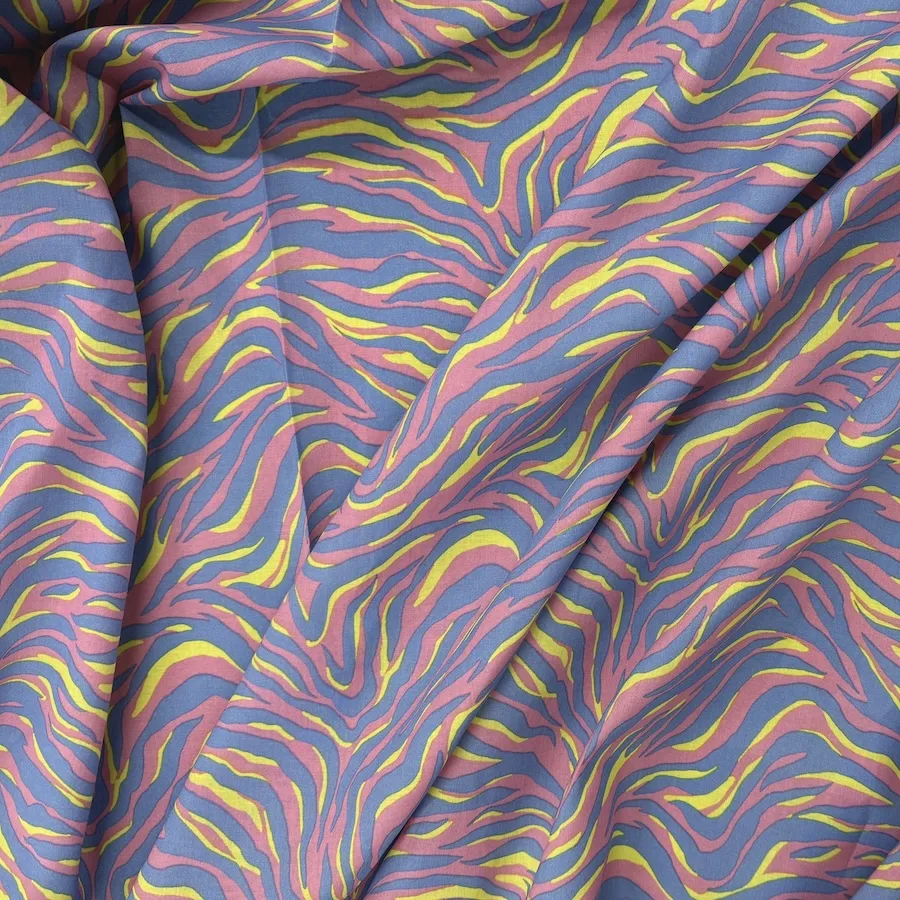 A beautiful lightweight 100% cotton voile fabric printed with a pastel toned tiger stripe design in pink, blue and yellow.