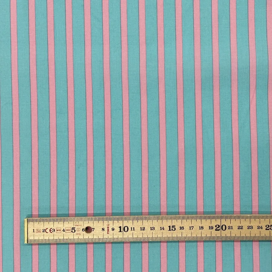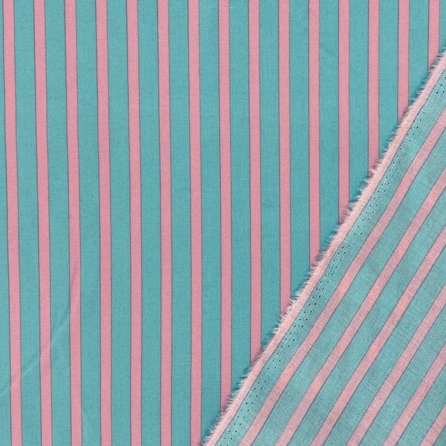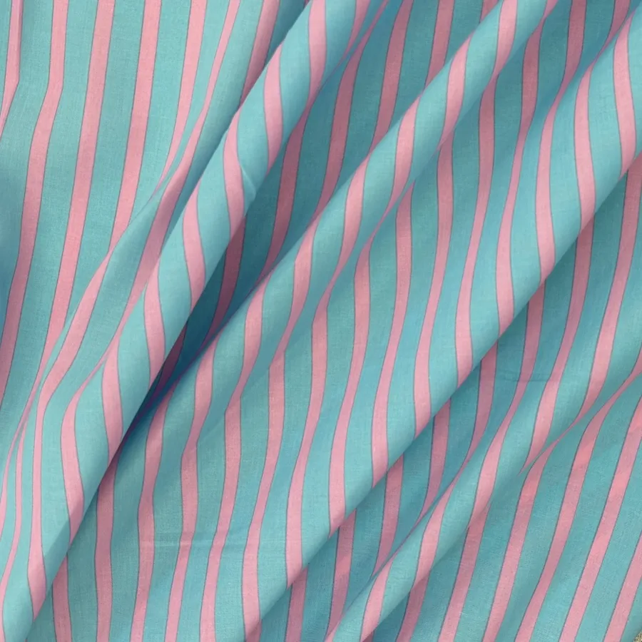 A beautiful lightweight 100% cotton voile fabric printed with pastel toned pink and blue stripes.