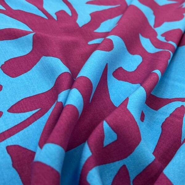 A lovely viscose fabric with beautiful drape and movement. This smooth, non stretch fabric features a bold silhouette design in burgundy and blue.