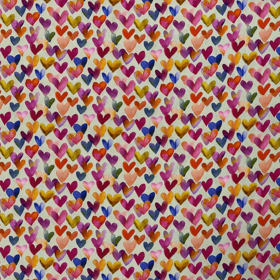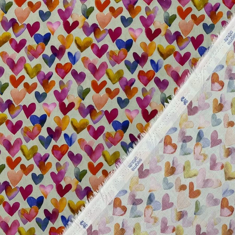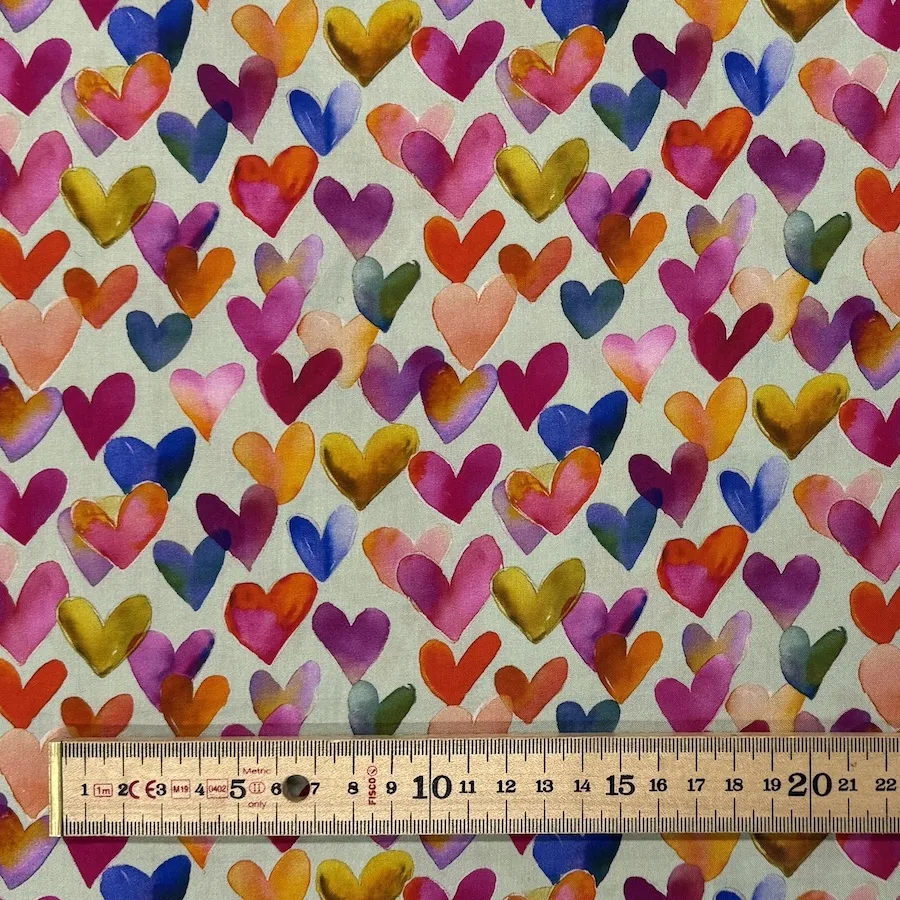 This gorgeous 100% viscose fabric is printed with multicoloured hearts on a light blue background.