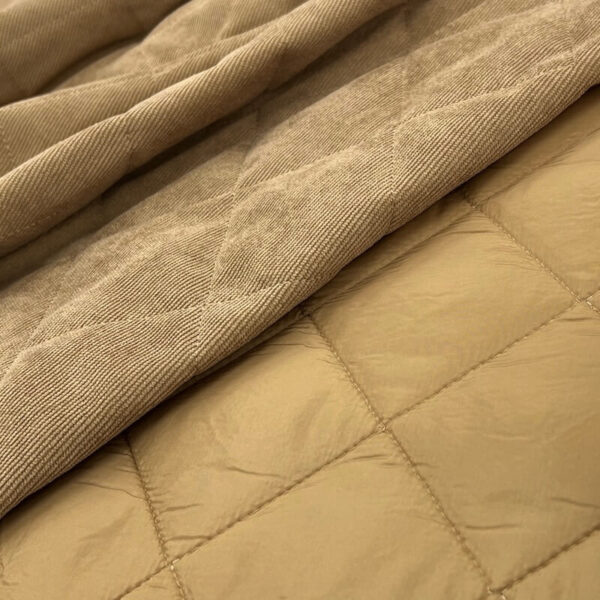 This double sided quilted fabric is a perfect choice for cooler weather garments. A layer of thin wadding is sandwiched between one layer of baby cord and a layer of smooth, lightweight nylon and quilted in a diamond pattern.