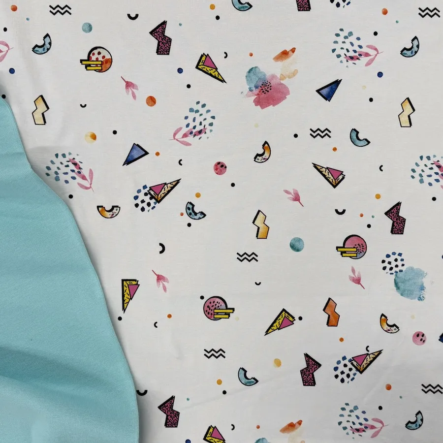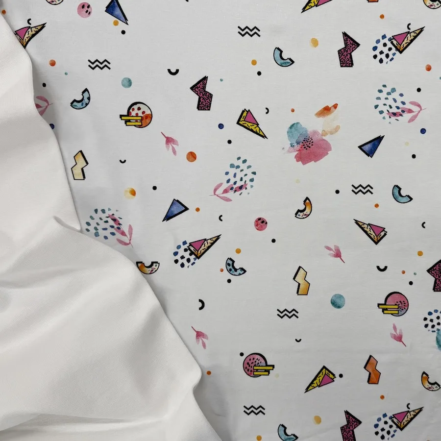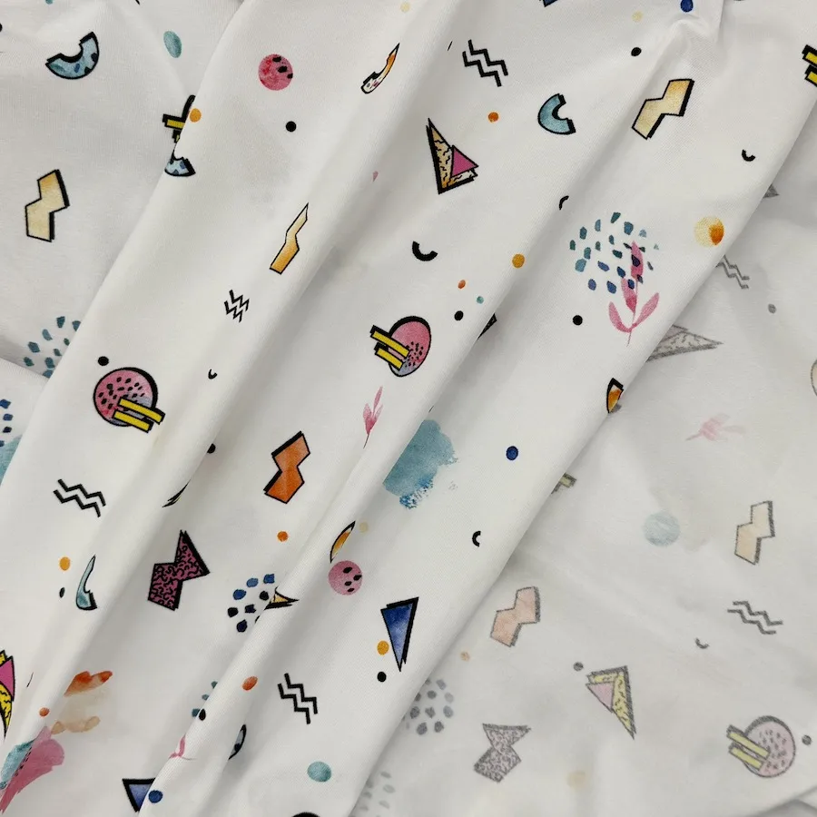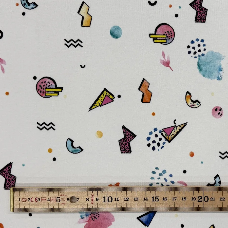 This beautifully soft stretch jersey has an 80s ‘Saved By The Bell’ style design featuring a colourful design on a white background.