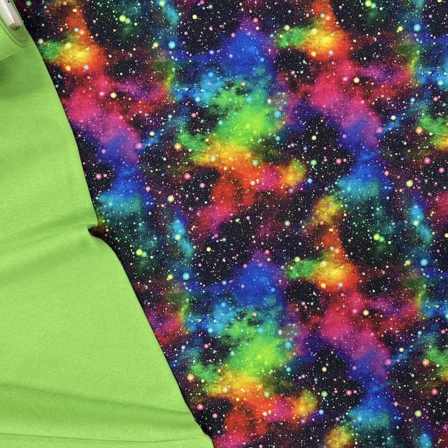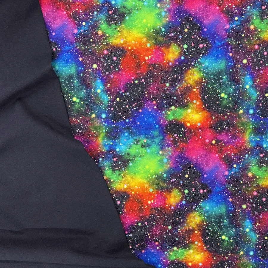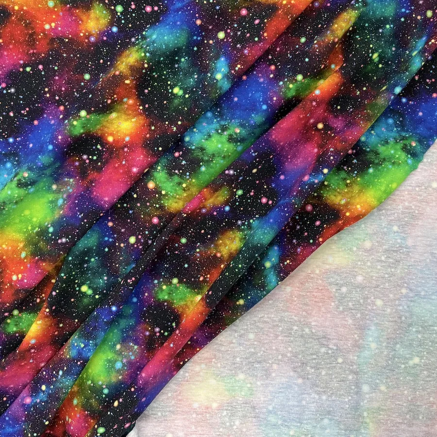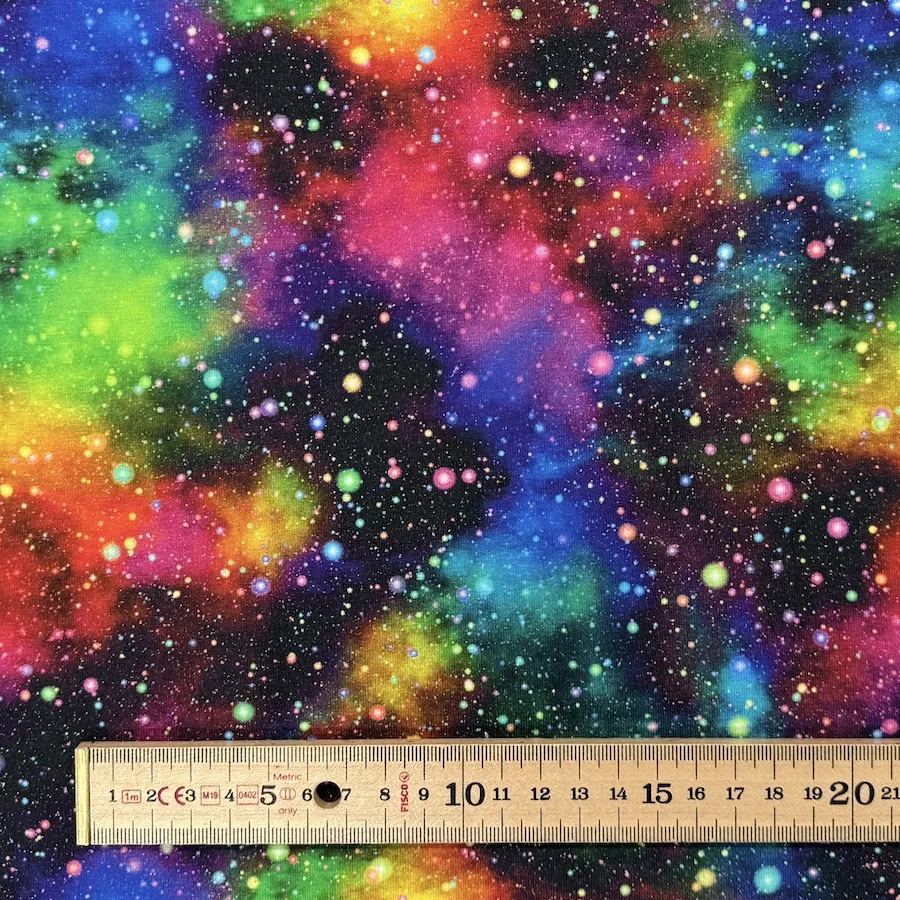 This beautifully soft stretch jersey has a galaxy design with multi coloured star bursts.