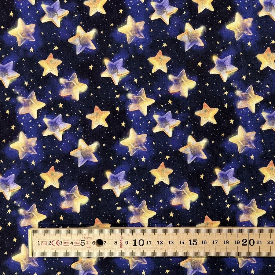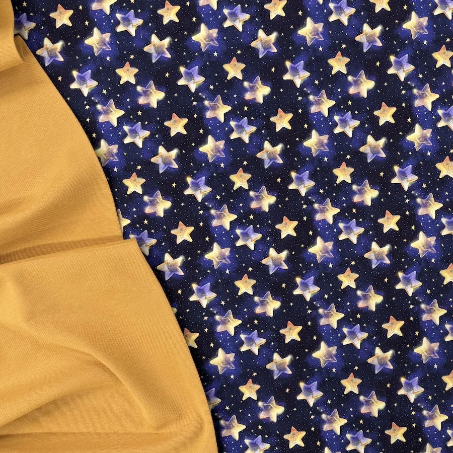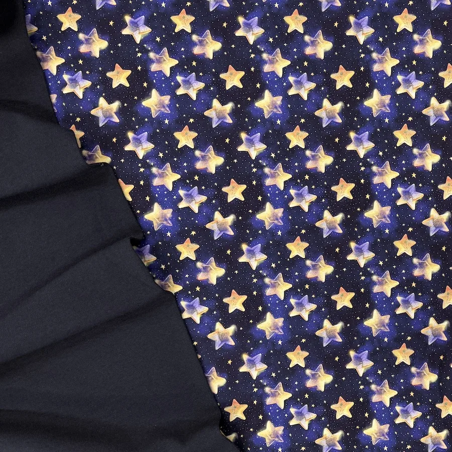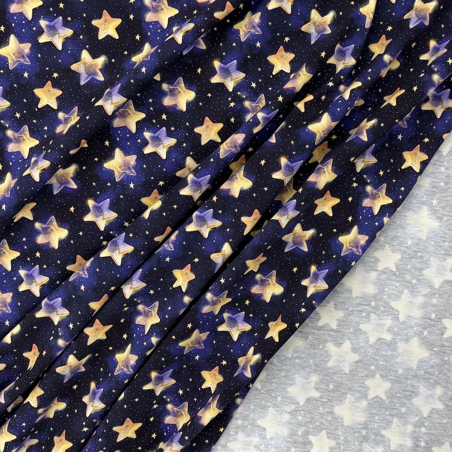 This beautifully soft stretch jersey has a star design with yellow and purple stars on a midnight background.