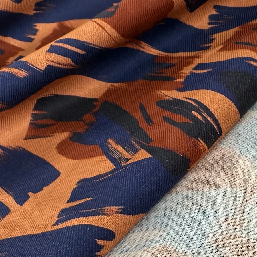 A luxurious blend of cotton and viscose creates this stunning twill fabric with beautiful drape and movement. It is digitally printed with navy blue and terracotta coloured brushstrokes on a lighter background.