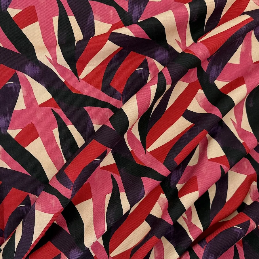 A luxurious blend of cotton and viscose creates this stunning twill fabric with beautiful drape and movement. It is digitally printed with an abstract leaf design in pinks and purples.