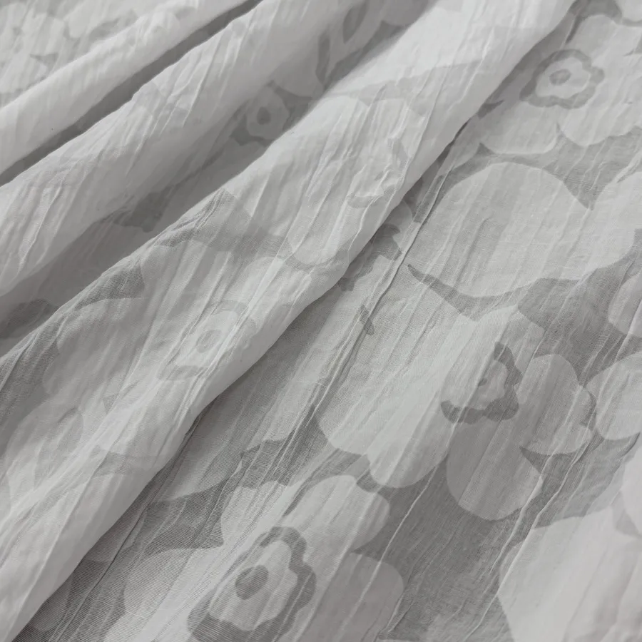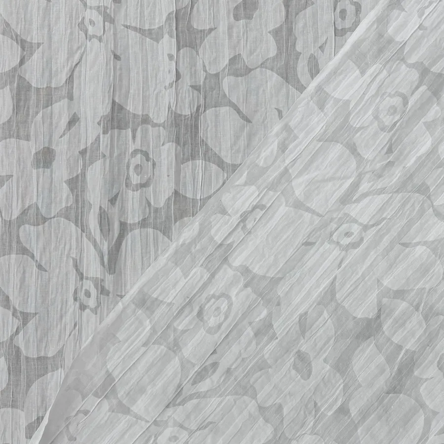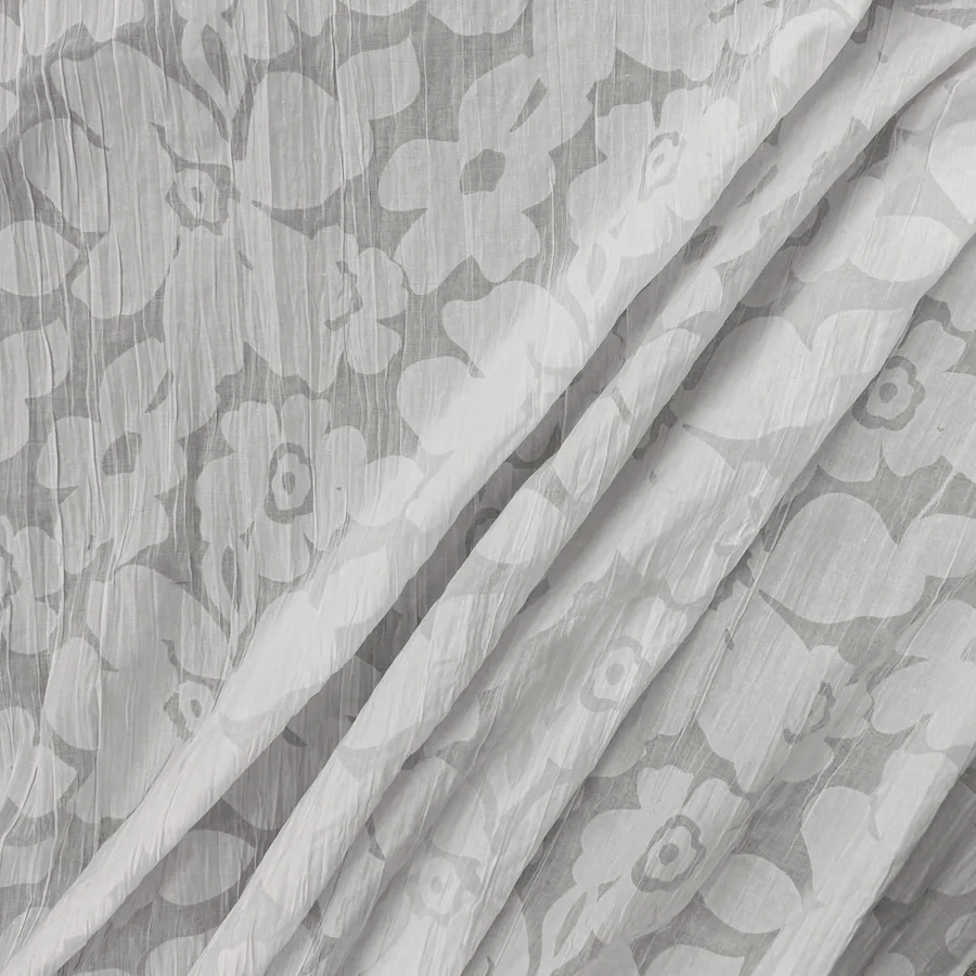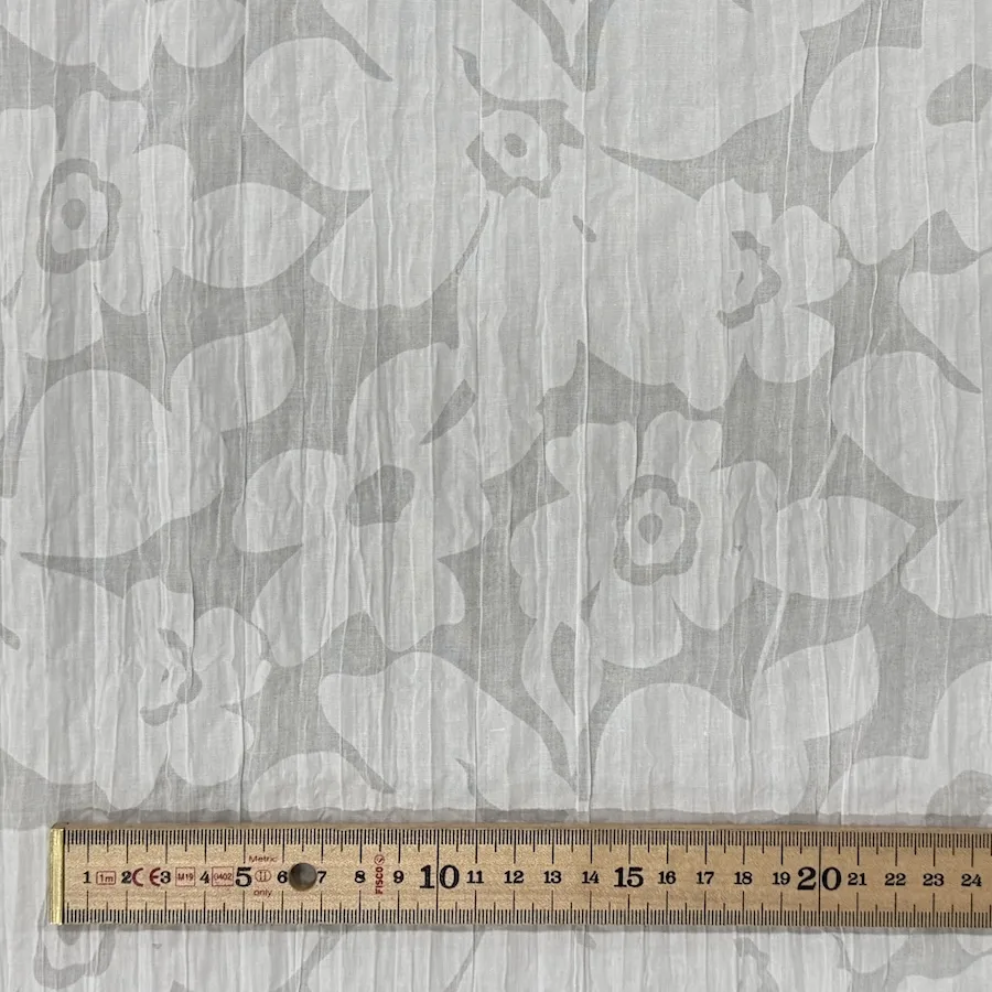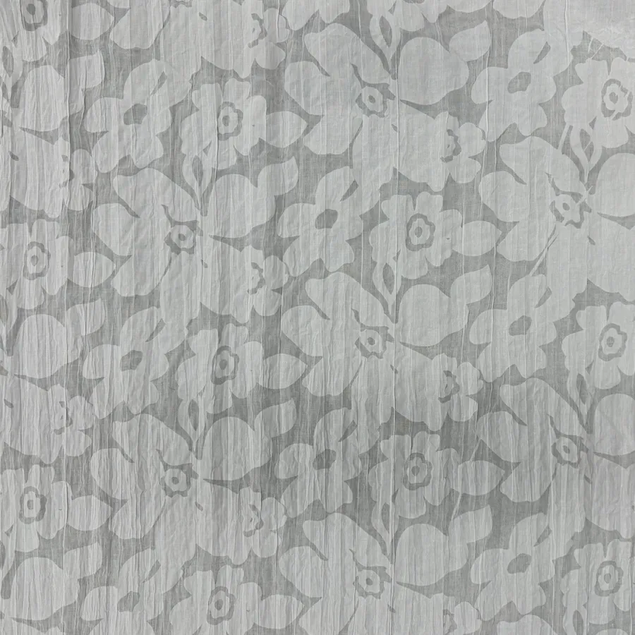 A lightweight poly cotton with a subtle crinkle texture and a floral pattern that plays with transparency makes up this wonderful lightweight woven fabric.
