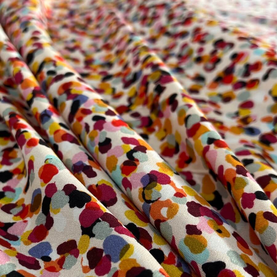 This smooth, soft fabric is printed with a bright and busy design by Rachel Parker and features overlapping multicoloured, irregular spots on a warm off-white background.