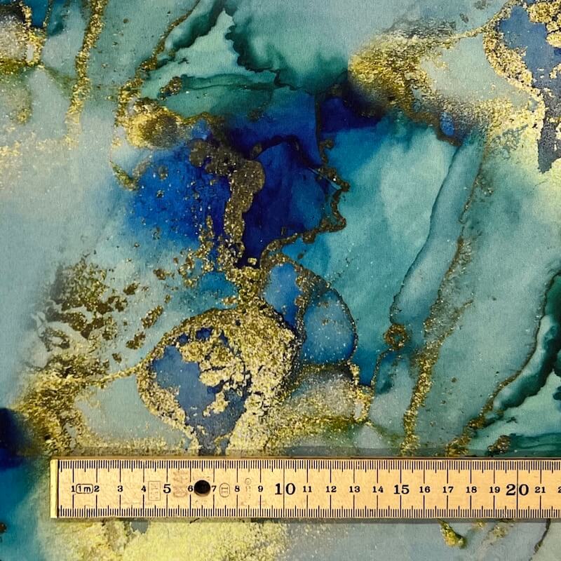 A gorgeous marble design in shades of turquoise and blue with bright gold highlights, printed onto water resistant polyester fabric and backed with super soft dark teal coloured fleece.