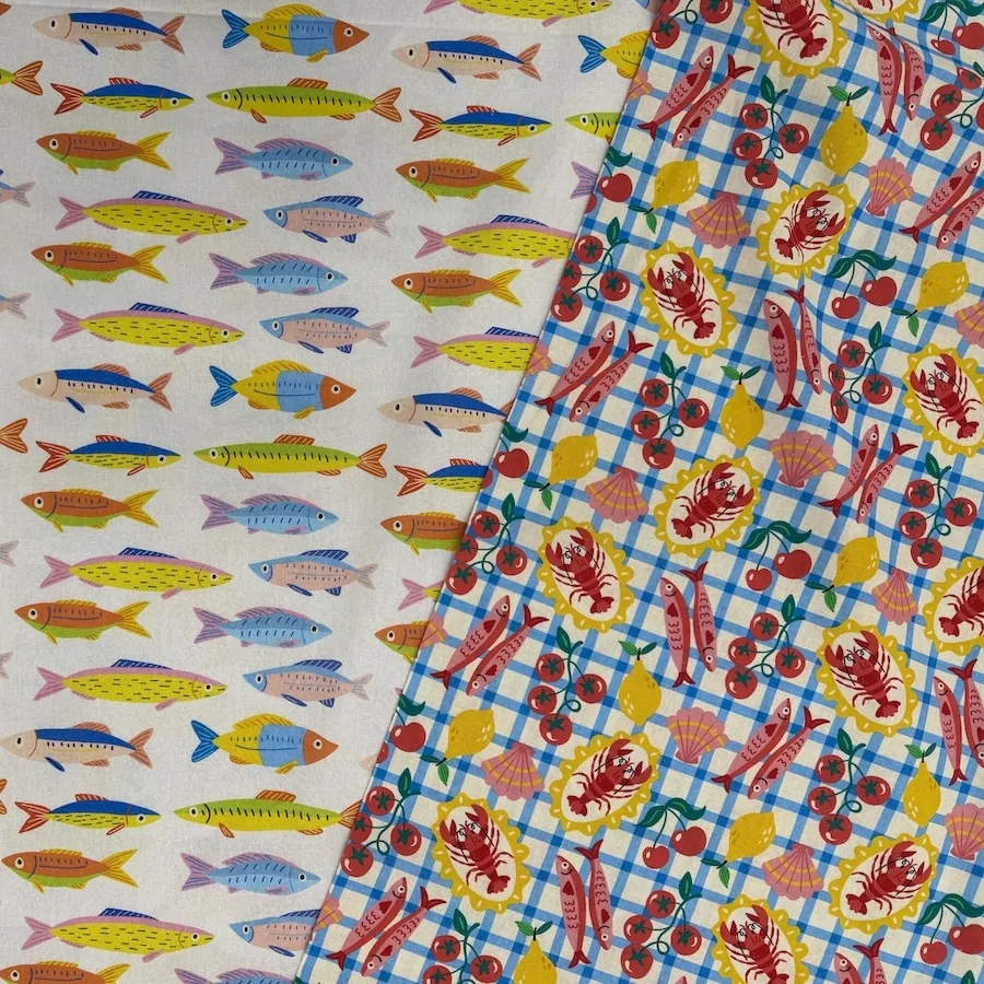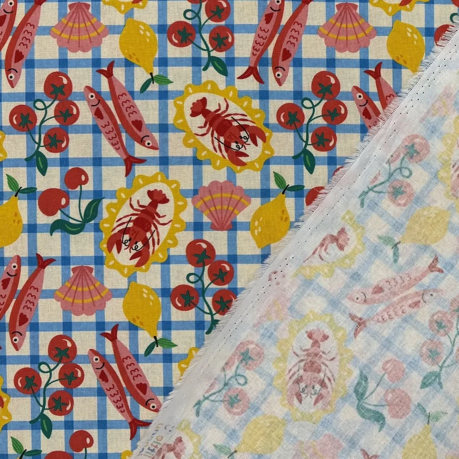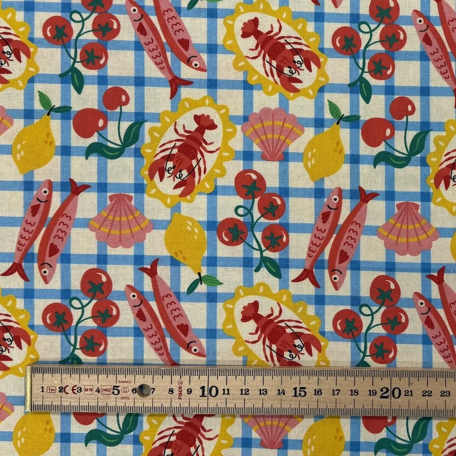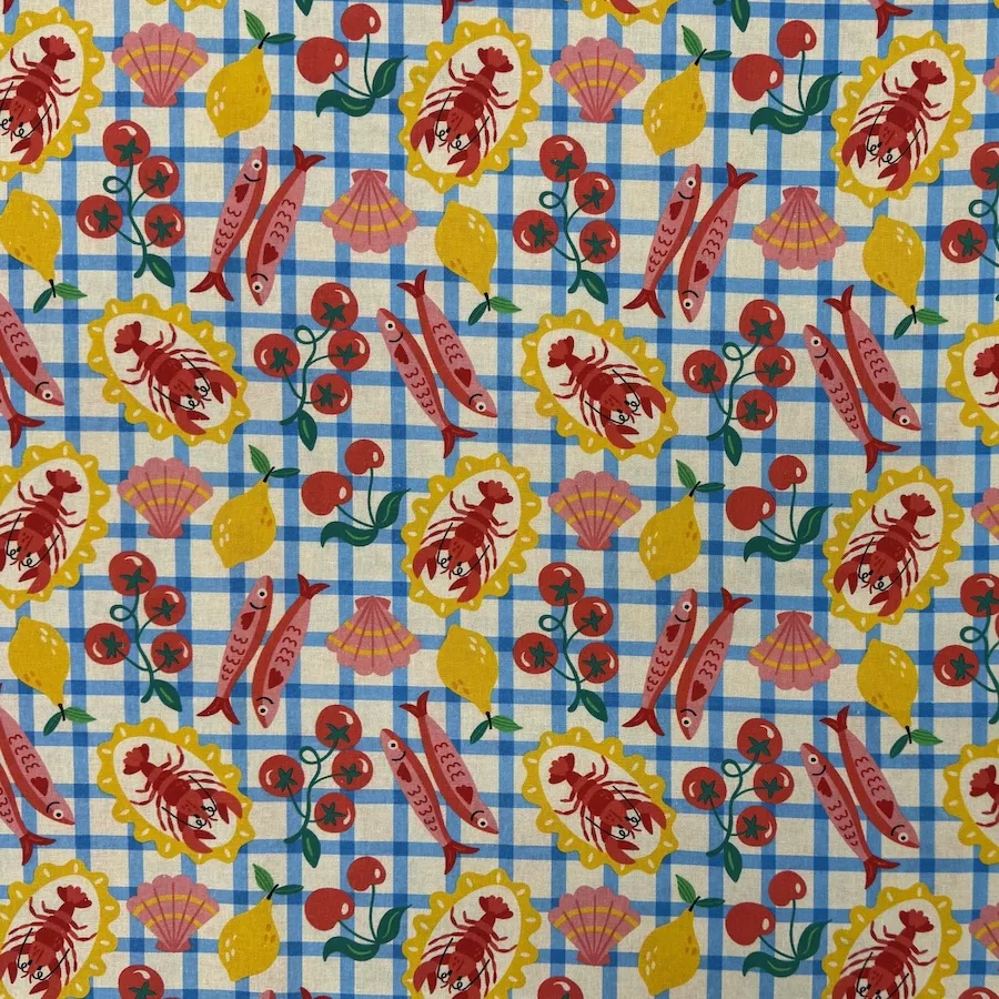 This 100% cotton fabric is printed with a colourful design featuring a feast of seafood and tomatoes laid out on a blue check tablecloth.