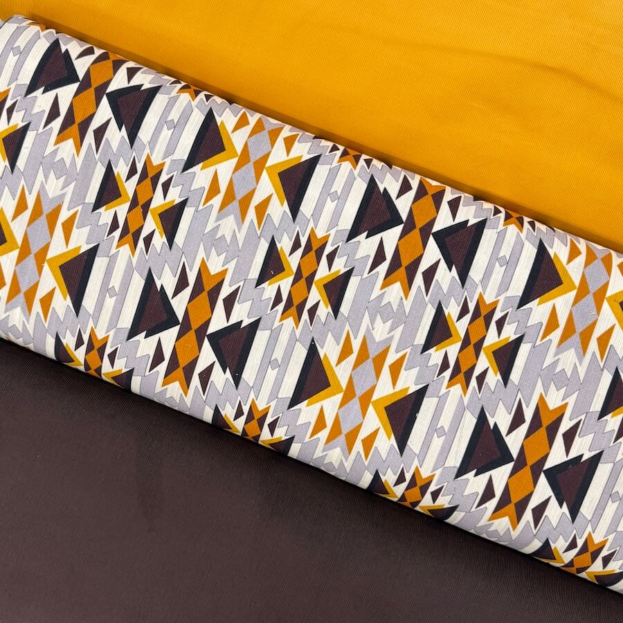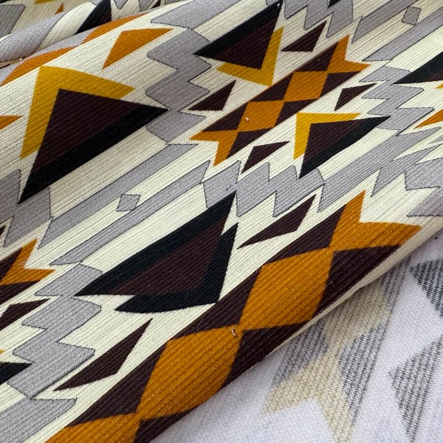 This 100% cotton fine wale corduroy from Little Johnny Fabrics is digitally printed with a bold Navajo-style pattern in rich earth tones.