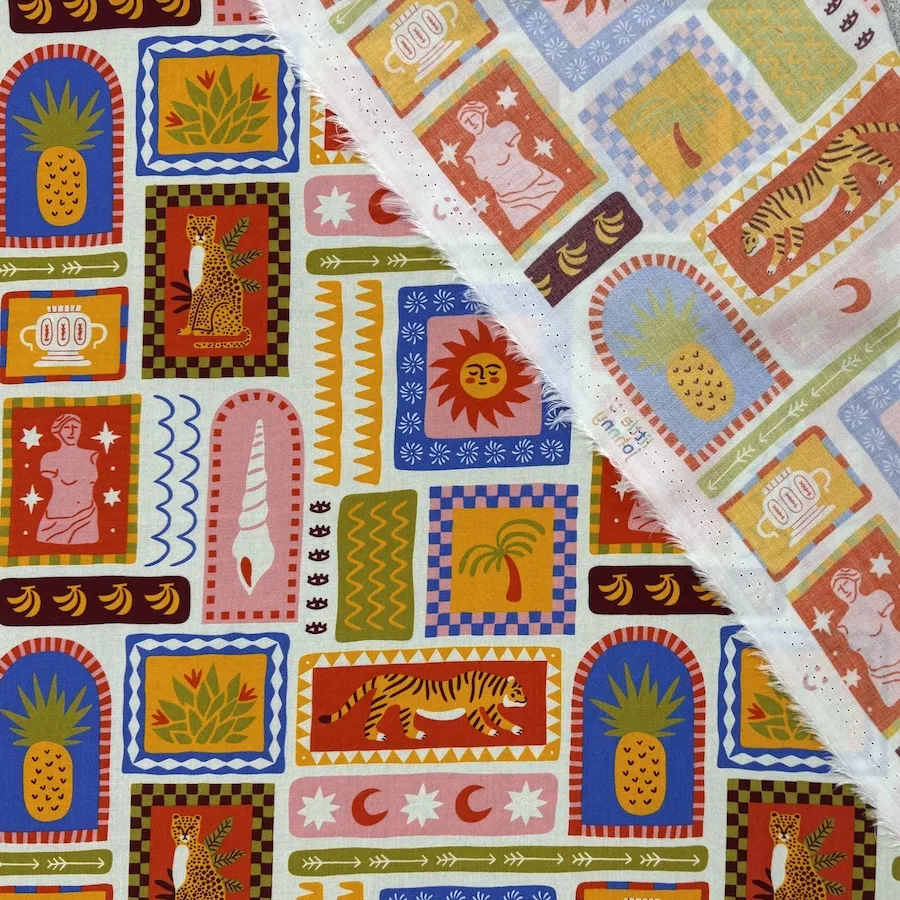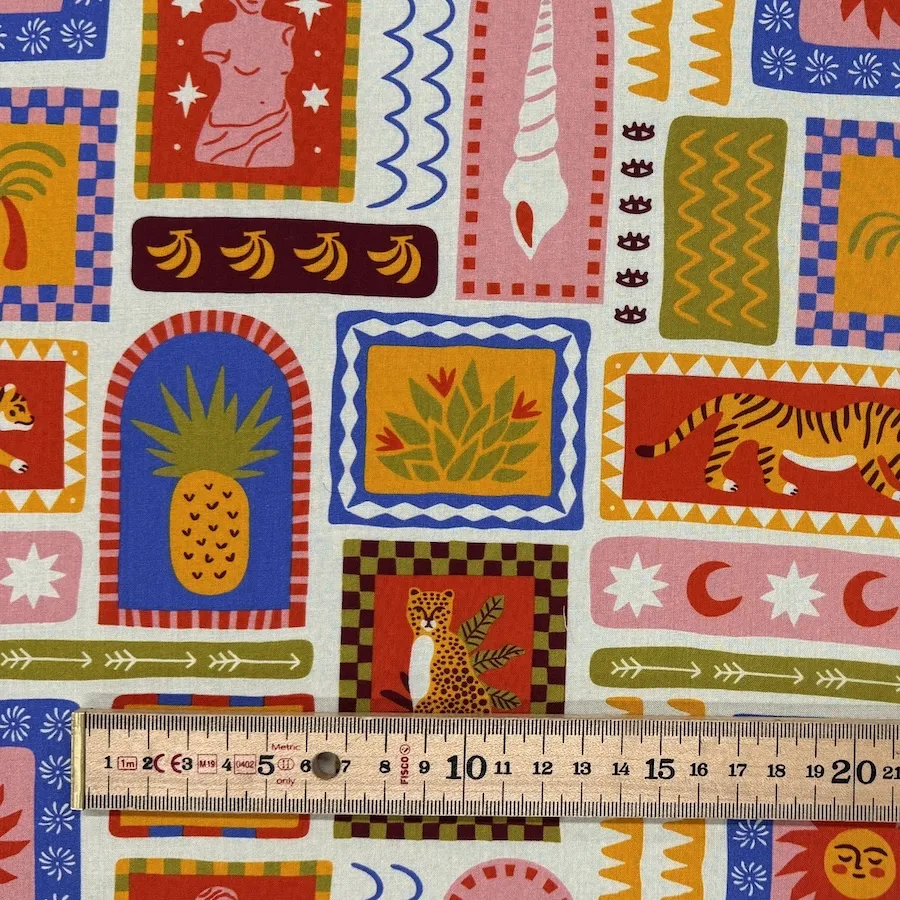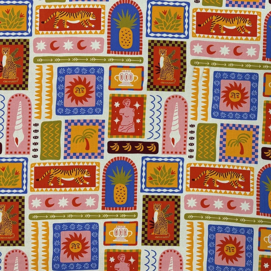 This gorgeous 100% viscose lawn fabric is printed with a colourful design of mini vistas featuring tigers, tropical fruits, classic art and abstract symbols – the perfect mix for a holiday vibe.