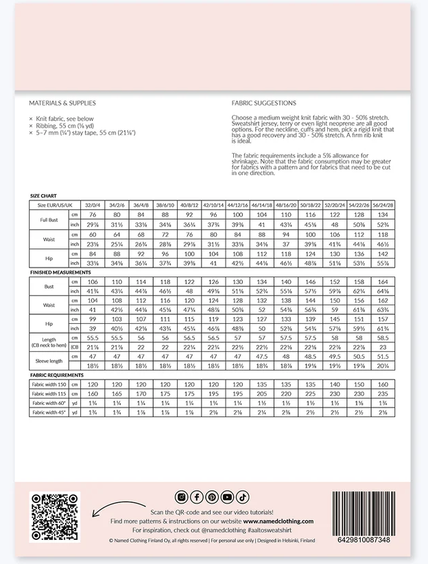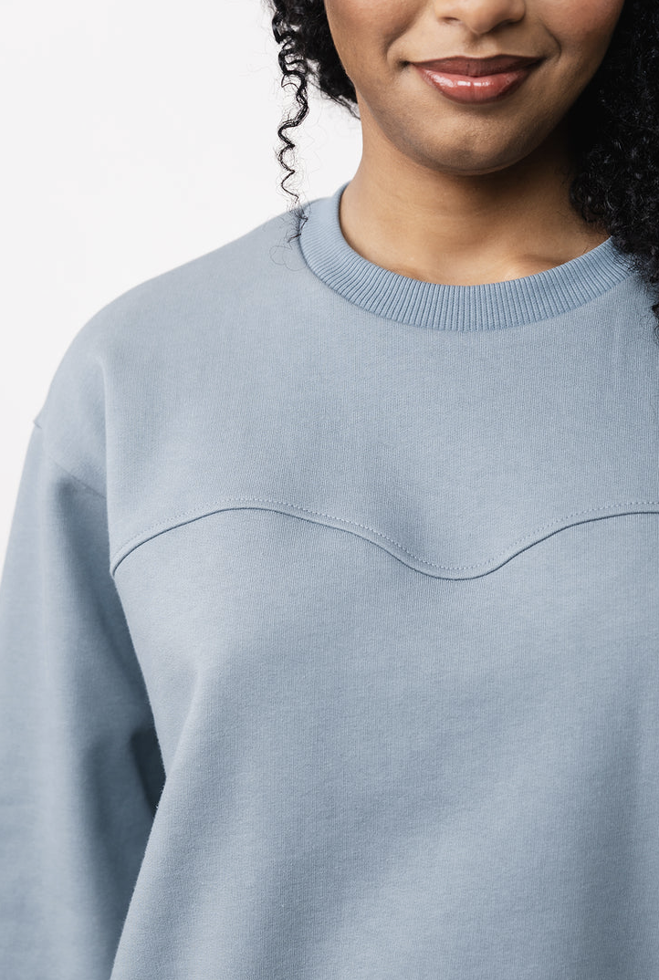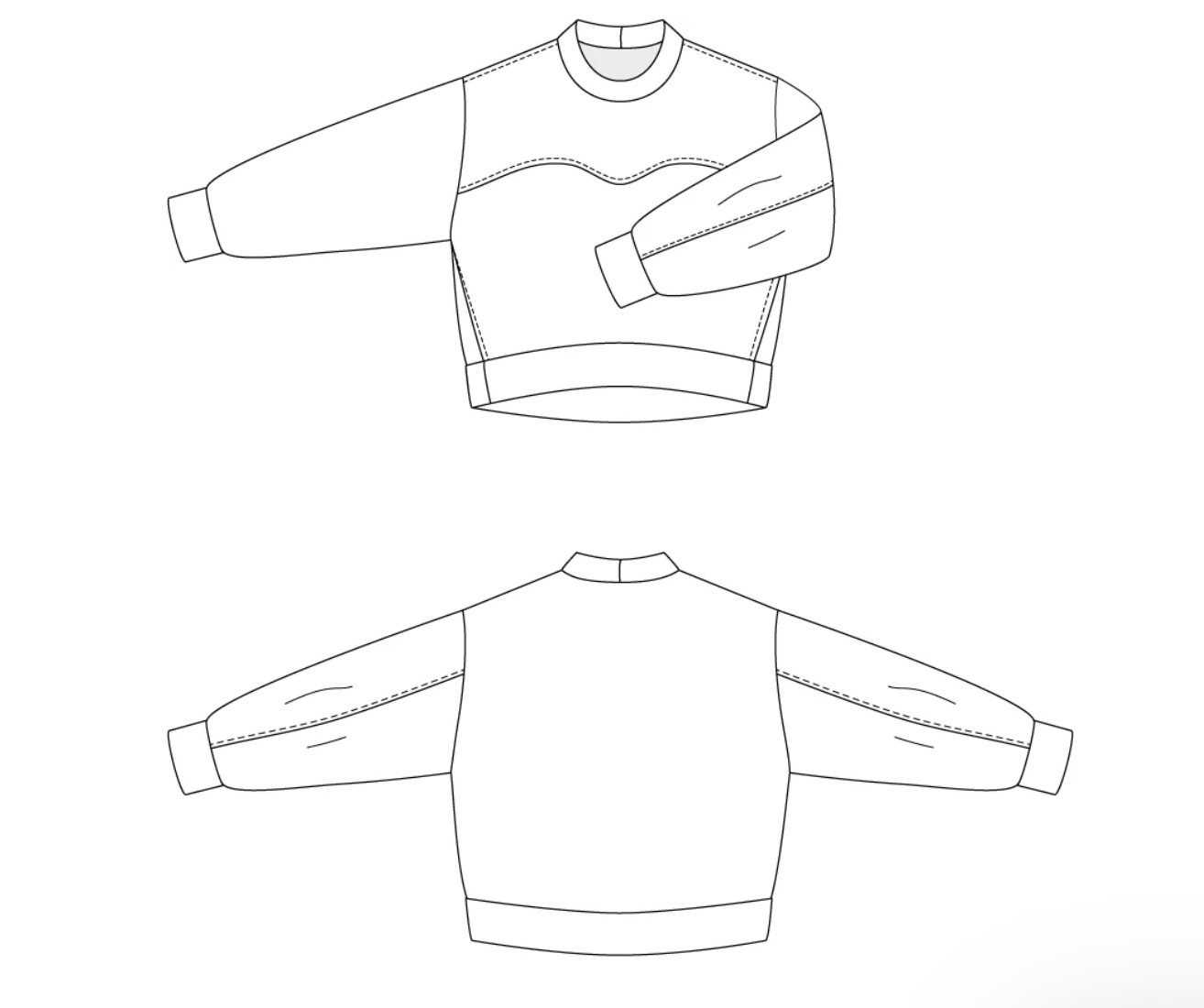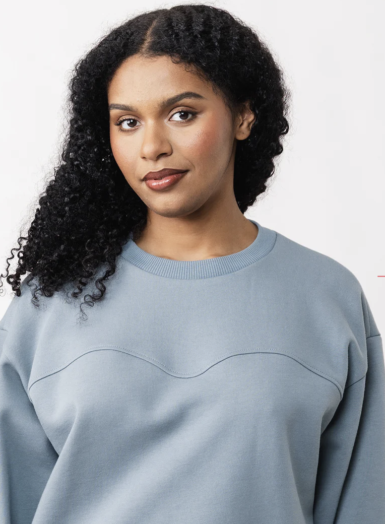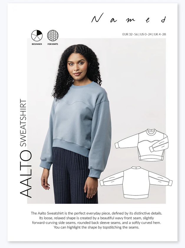 Aalto Sweatshirt is the perfect everyday sewing pattern defined by its distinctive details. Its loose, relaxed shape is created by a beautiful wavy front seam, slightly forward-curving side seams, rounded back sleeve seams, and a softly curved hem. You can highlight the shape by topstitching the seams.