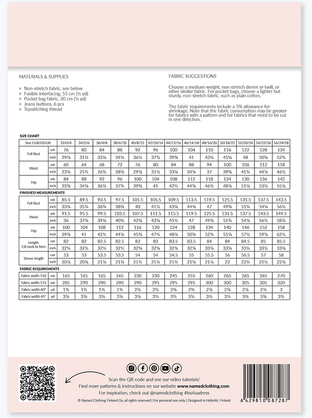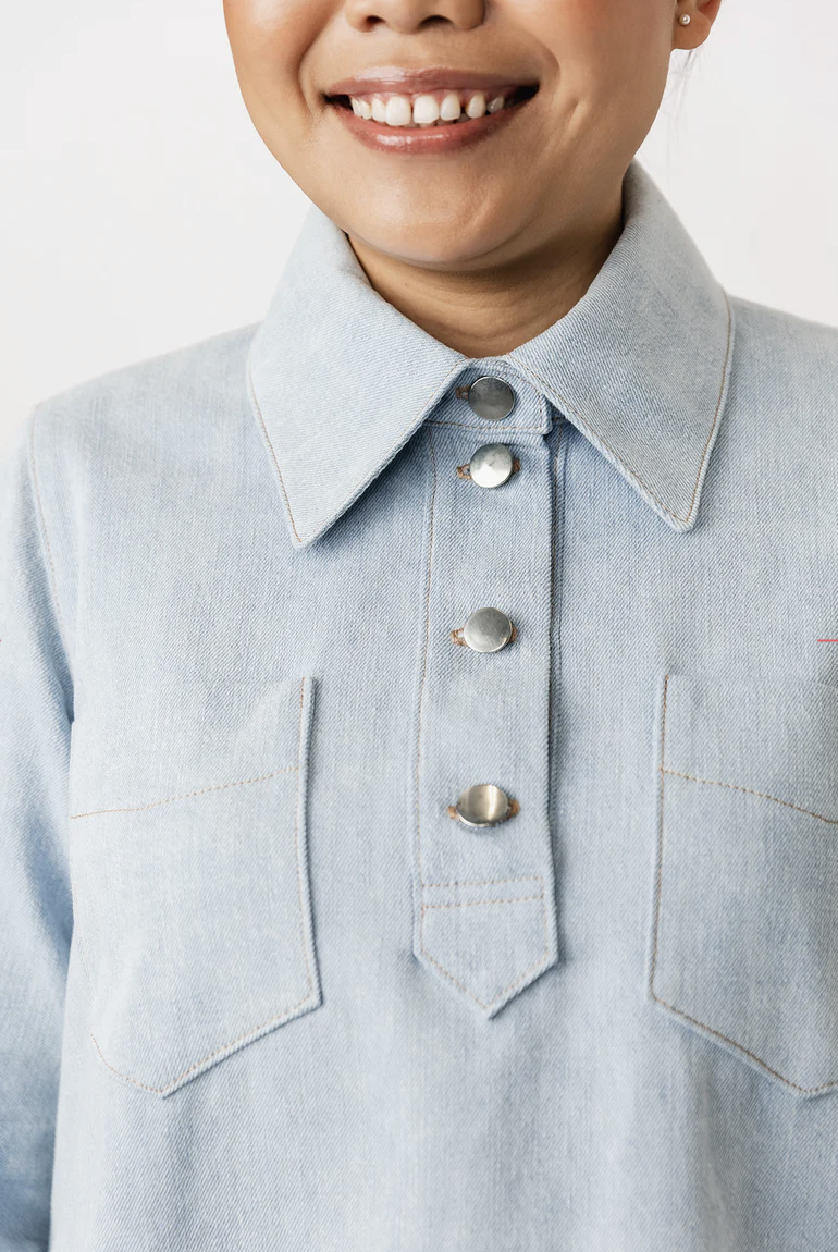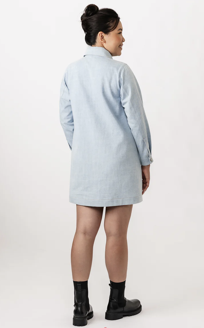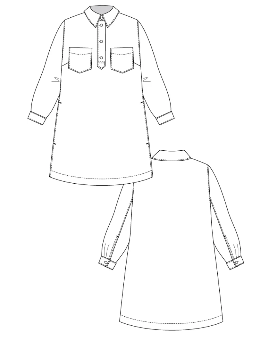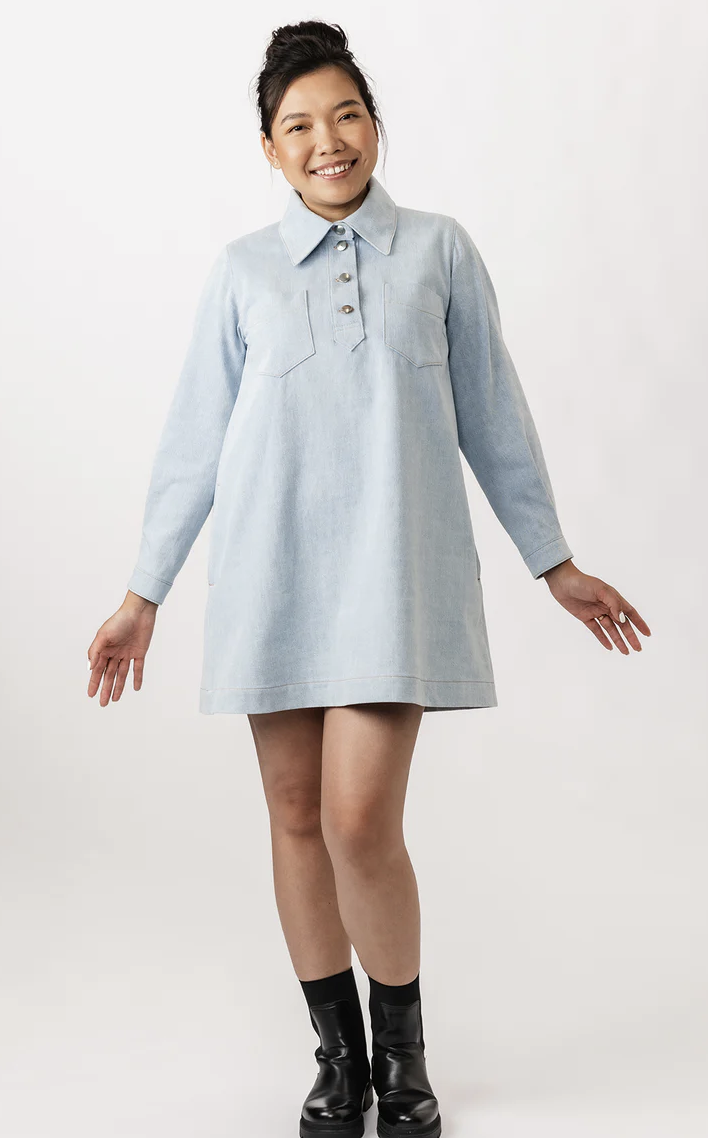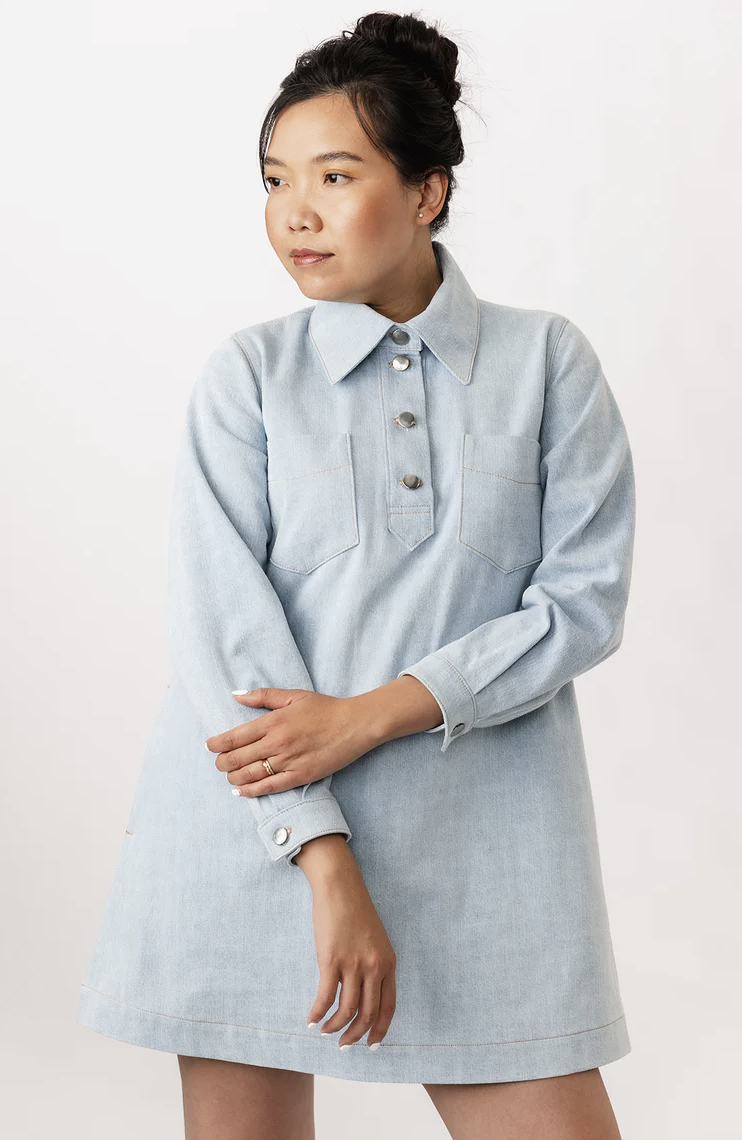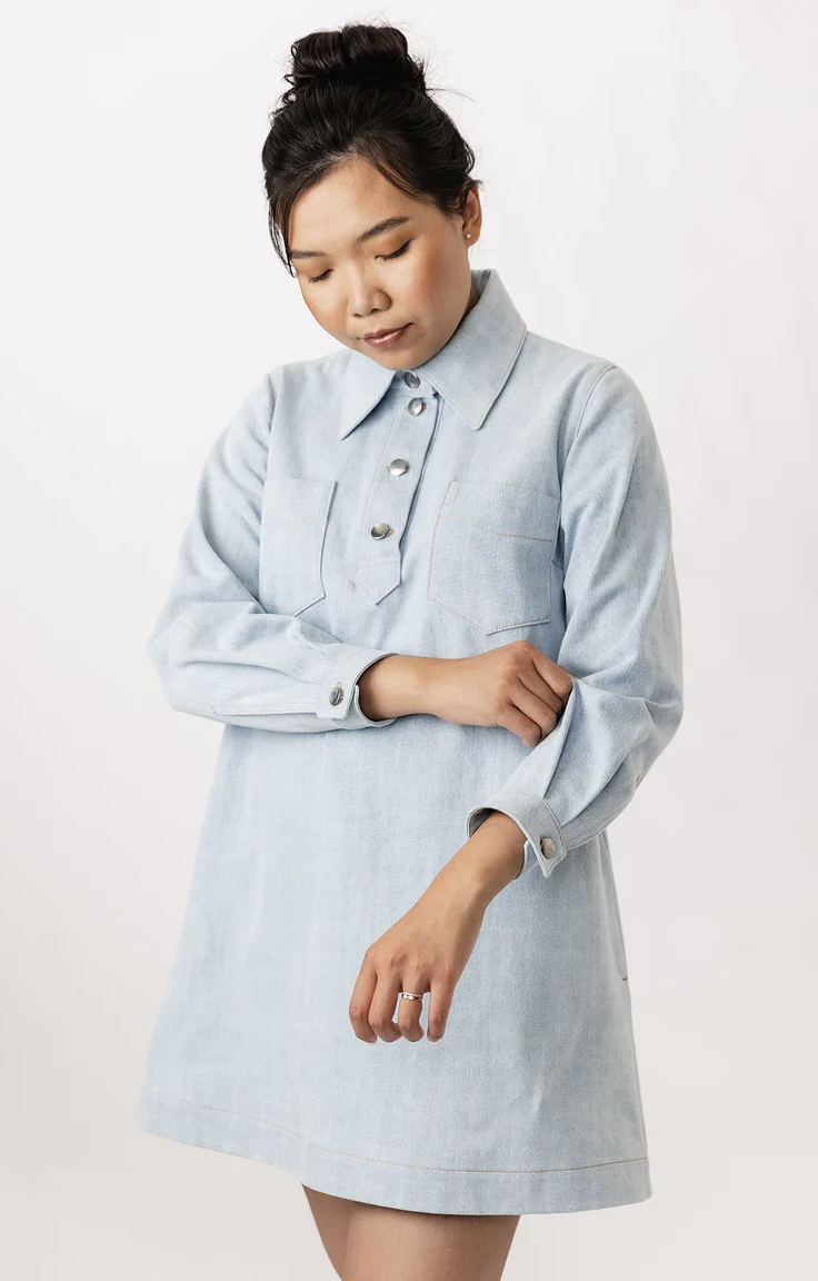 Loviisa is a modern and urban a-line mini jeans dress sewing pattern. The large collar, chunky button placket, and angular chest pockets make this classic style more edgy. The dress also features handy side pockets and cuffed long sleeves. The pleats and slits on the cuffs add volume and lightness to the sleeves. The dress is decorated throughout with subtle topstitching.