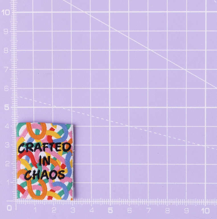 Crafted in chaos is a label for makers who thrive in the chaos. Bold black lettering on a crisp white background, layered over a rainbow burst of tangled threads – echoing the scraps, snips, scattered ideas and beautiful disorder of a real craft space.
