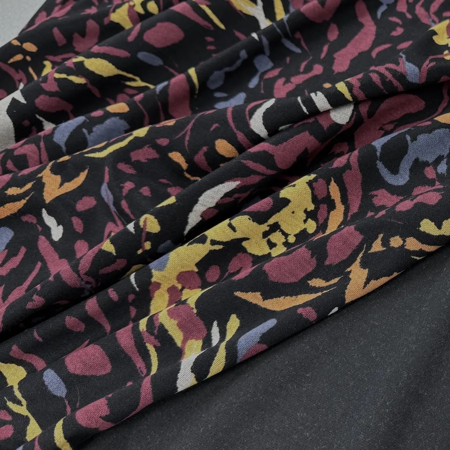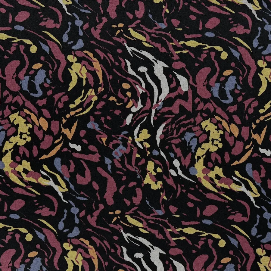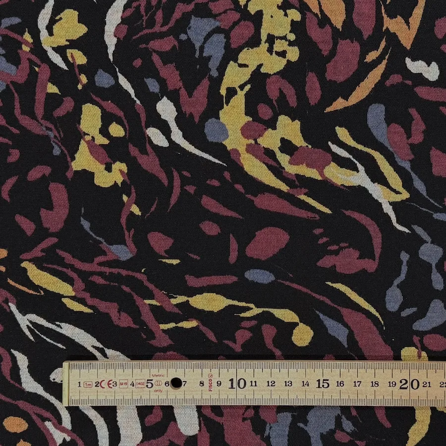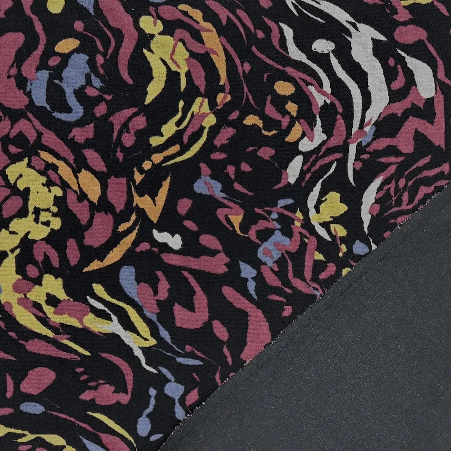 A superb quality ponte roma double knit fabric, with a smooth, soft handle and a busy printed on the face side with an abstract pattern. The reverse a plain black.