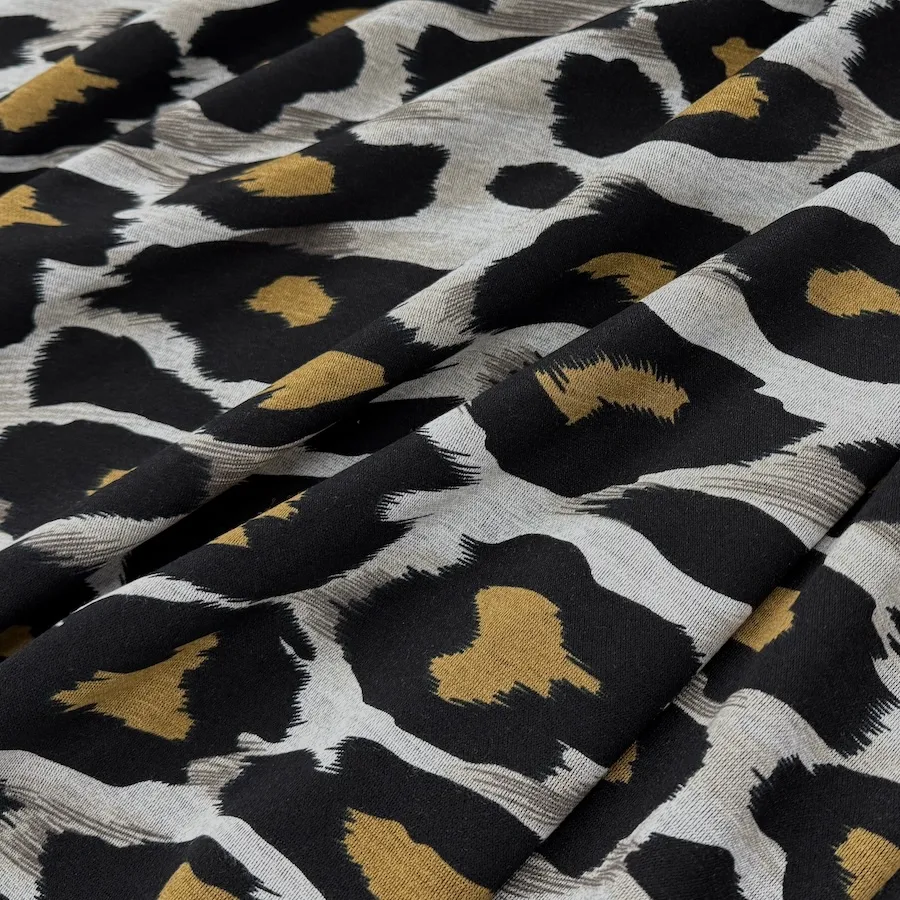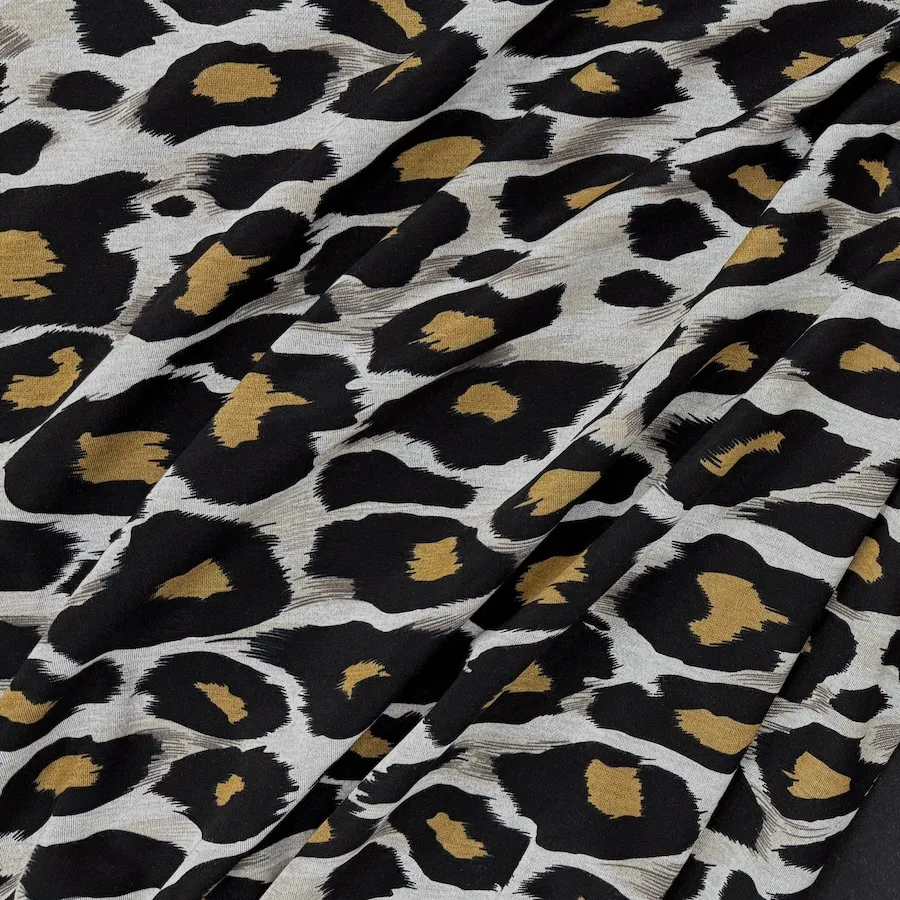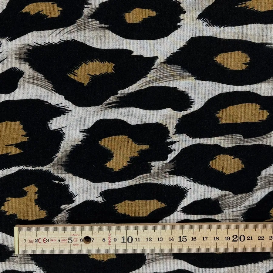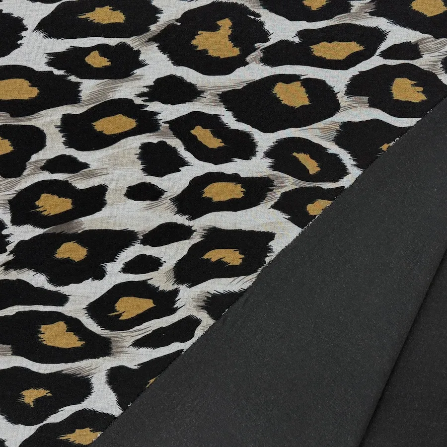 A superb quality ponte roma double knit fabric, with a smooth, soft handle and printed on the face side with a leopard print design. The reverse plain black.