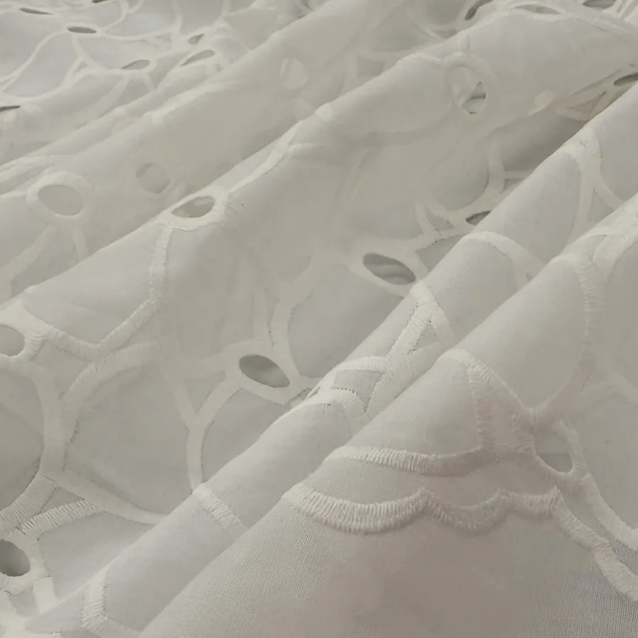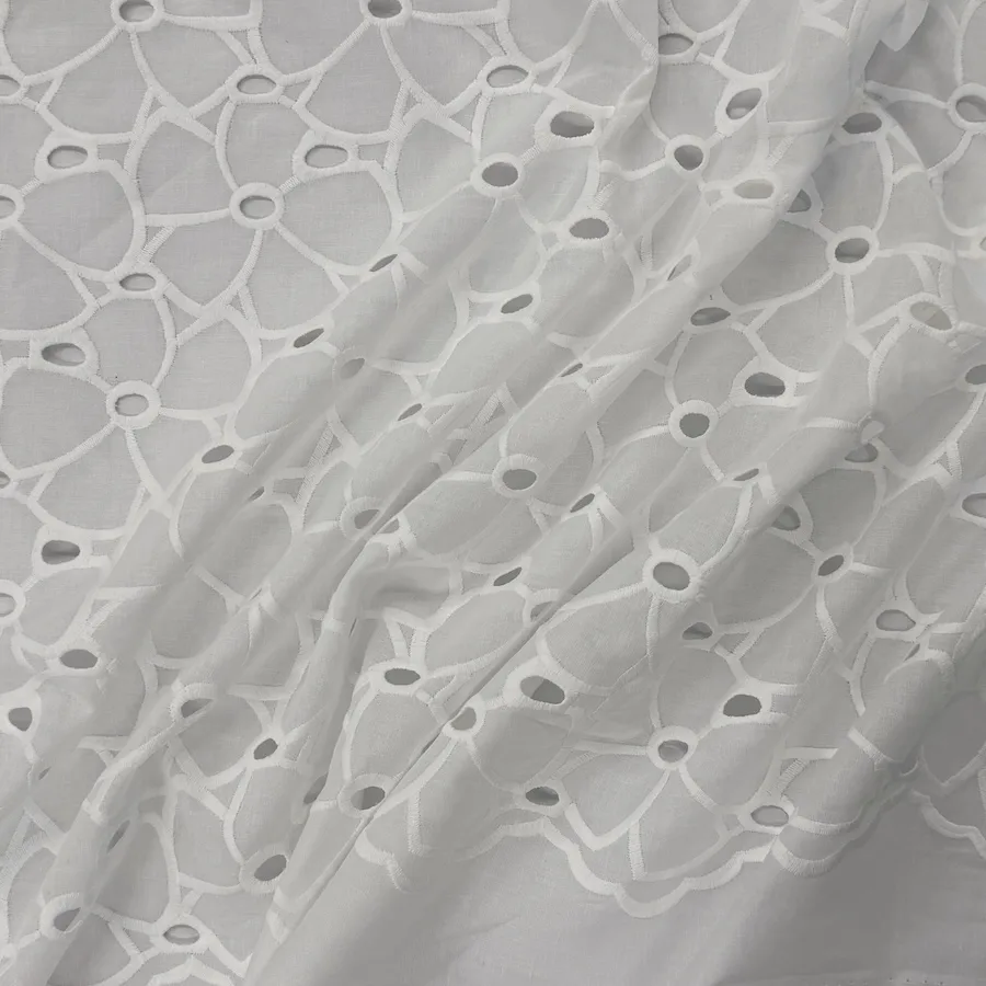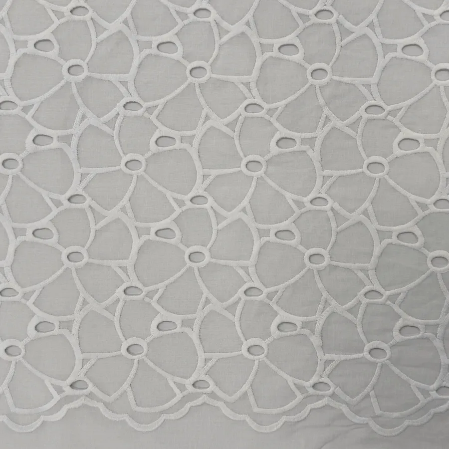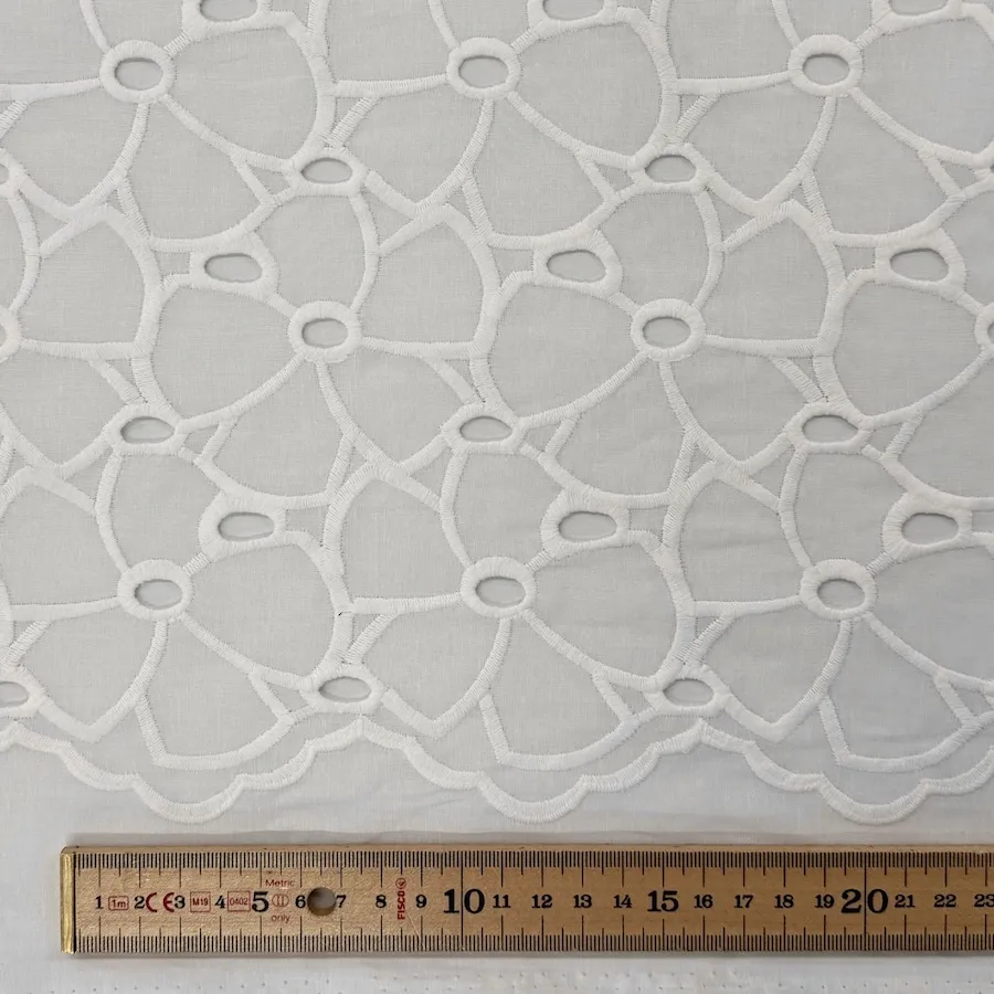 A beautiful lightweight 100% Cotton featuring embroidered interlinking flowers with eyelet holes in the middle of each flower.