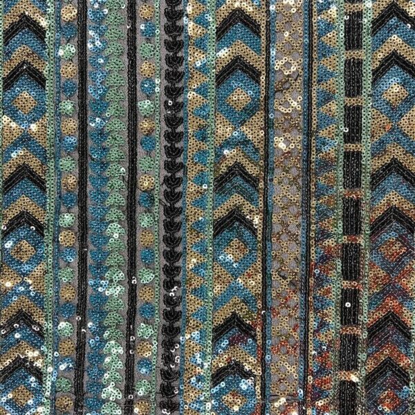 Green, blue, gold and black sequins are sewn in tribal style stripes featuring geometric chevrons and symmetrical patterns.