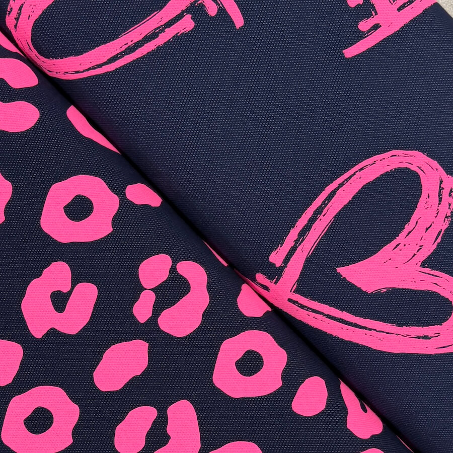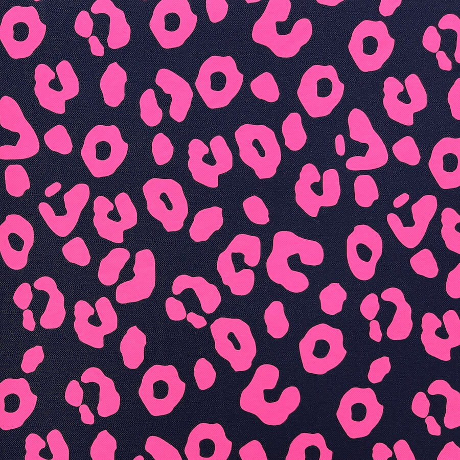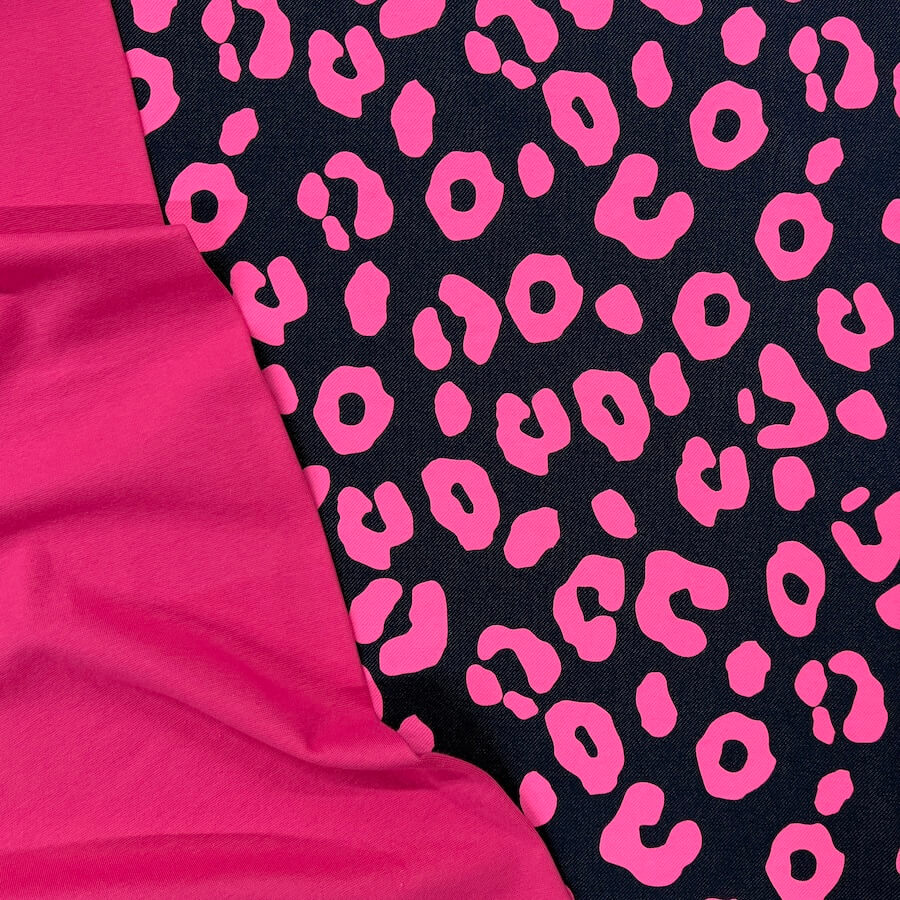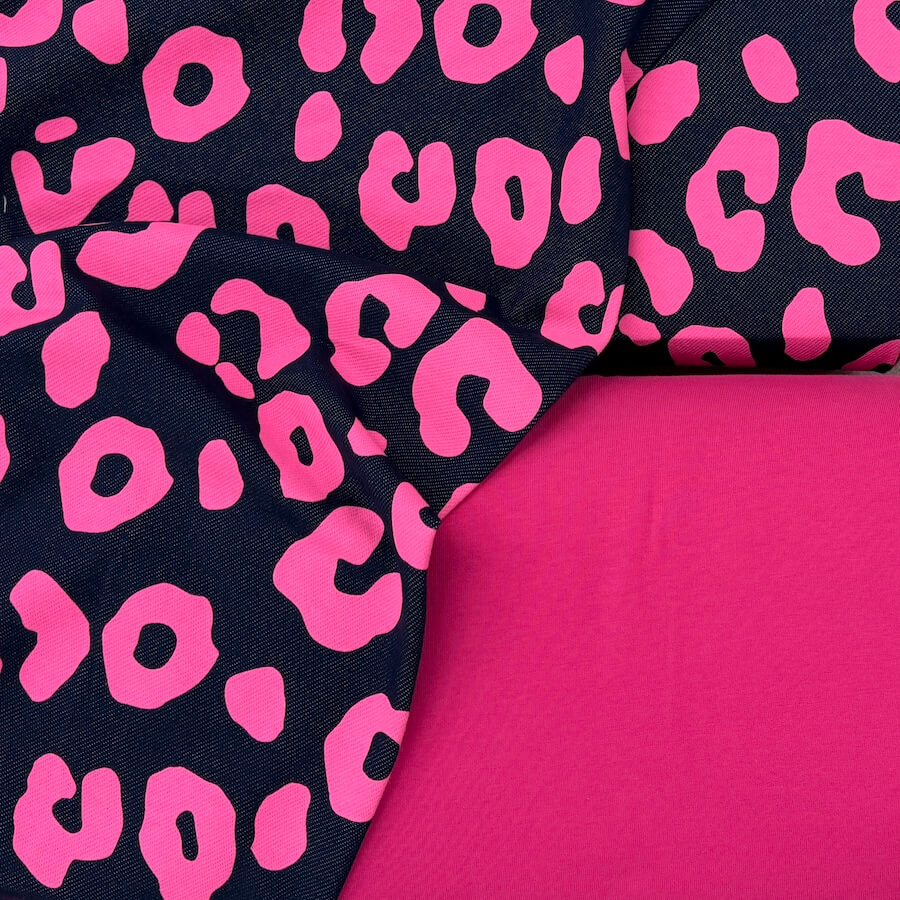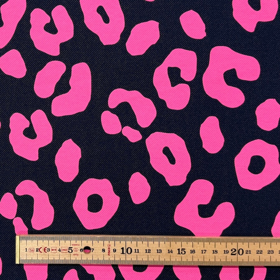 This gorgeous Loop Back French Terry is knitted to look like classic indigo denim with a wonderfully vivid neon pink leopard skin design printed on top. The print is fantastic quality and does not lose any colour when stretched out.