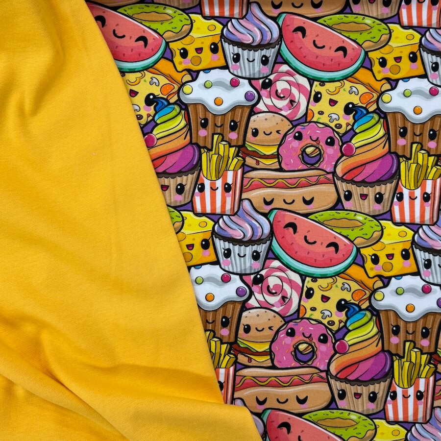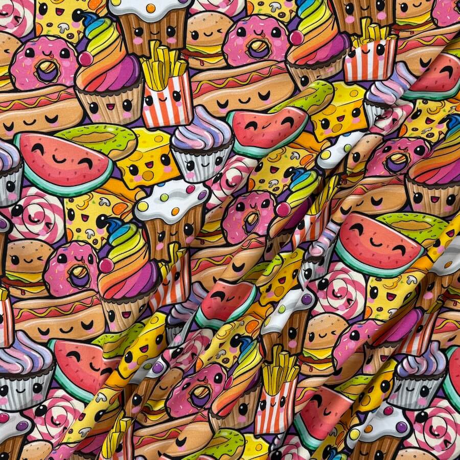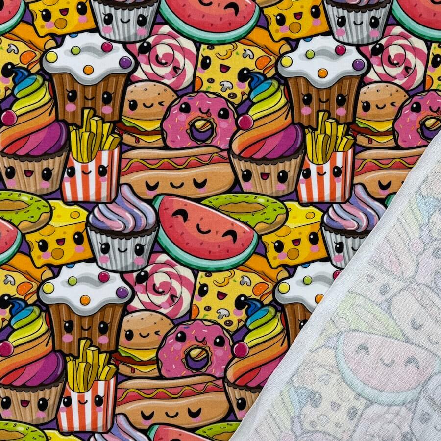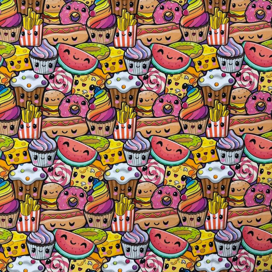 This bright and busy cute food design comes with Oeko-Tex 100 Certification.
