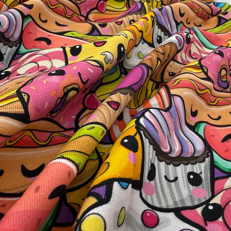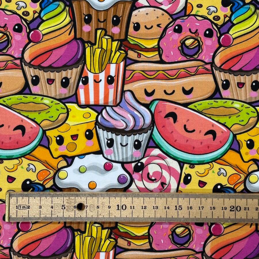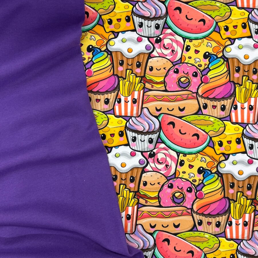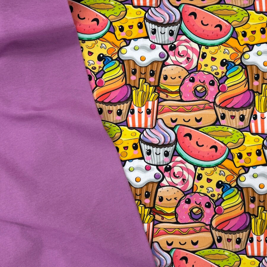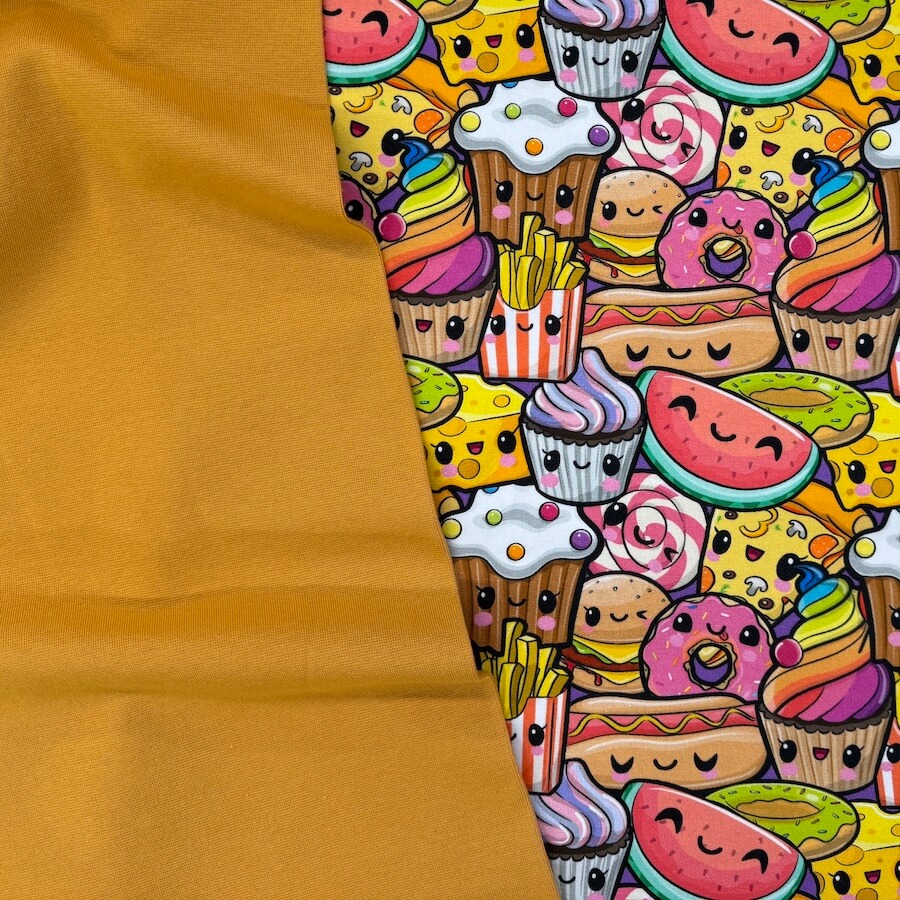 This bright and busy cute food design comes with Oeko-Tex 100 Certification.