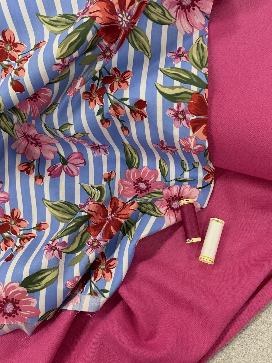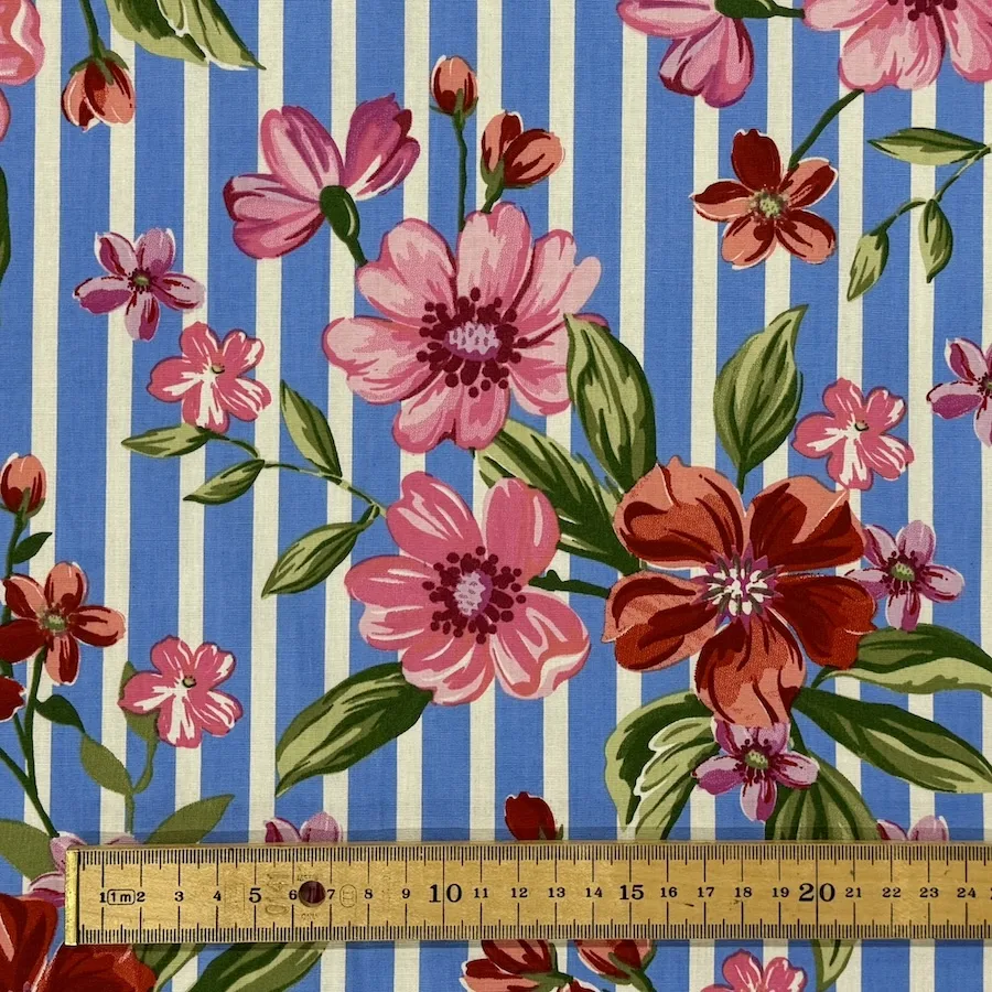 The fresh blue and white stripe design is overlayed with bold pink flowers.