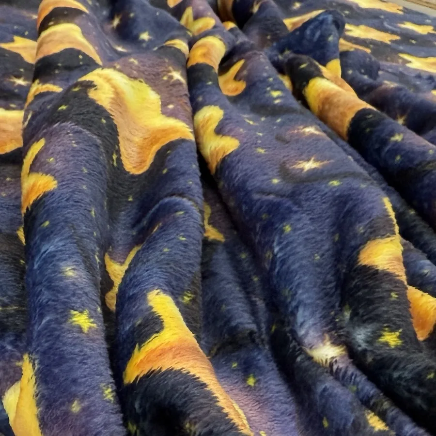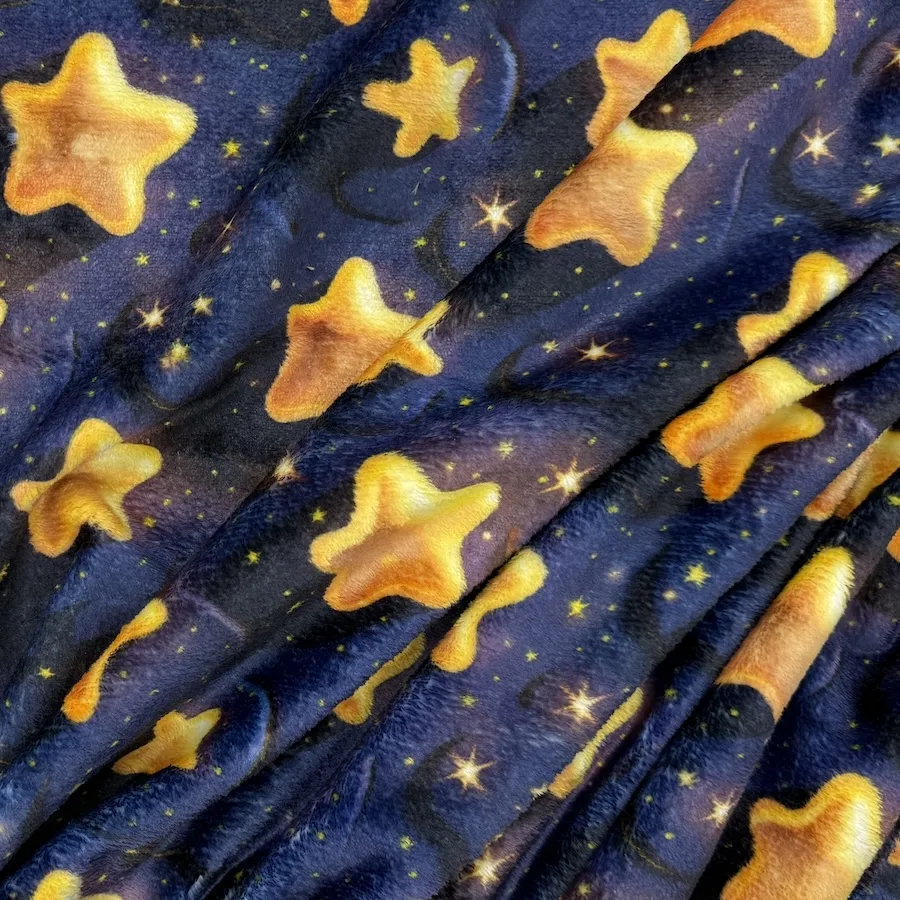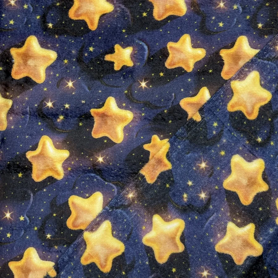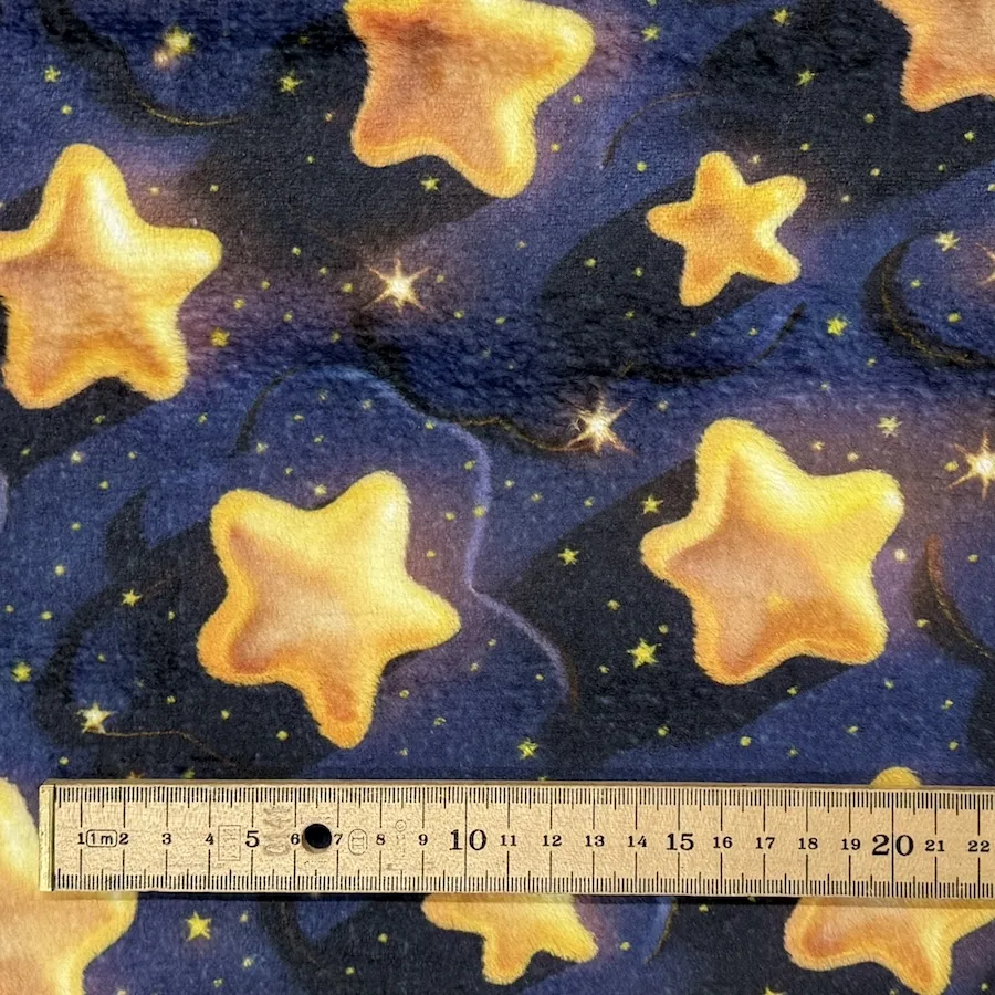 This beautiful cuddle fleece is incredibly cosy. It has a short, thick pile yet it is lightweight and supple. Digitally printed with a shining gold stars on a deep galaxy blue background.