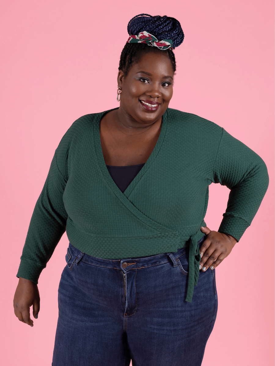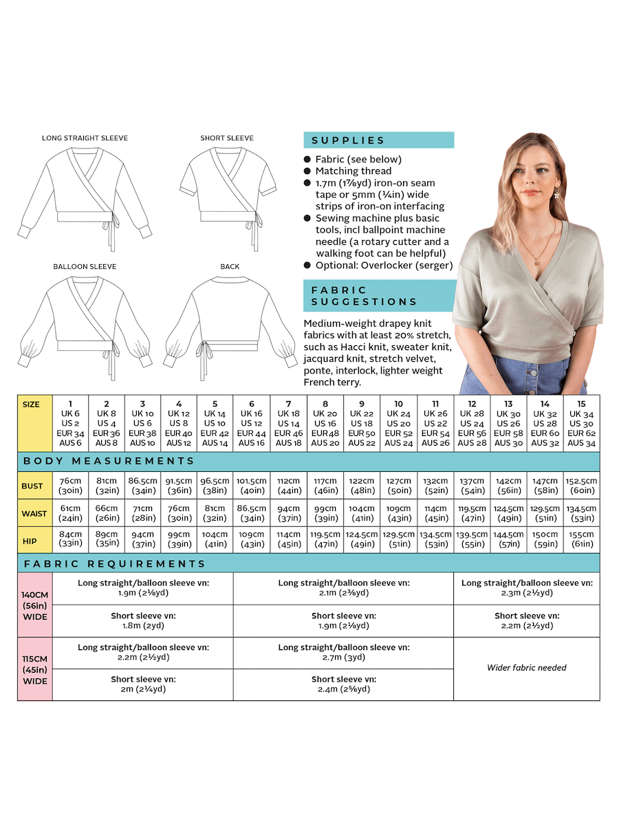 FABRIC SUGGESTIONS – Medium-weight drapey knit fabrics with at least 20% stretch, such as Hacci knit, sweater knit, jacquard knit, stretch velvet, ponte, interlock, lighter weight French terry.