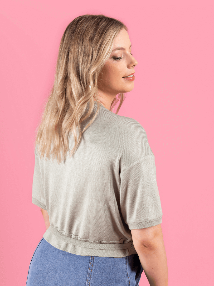 - Cropped hemline finished with a deep hem band which sits on the waist