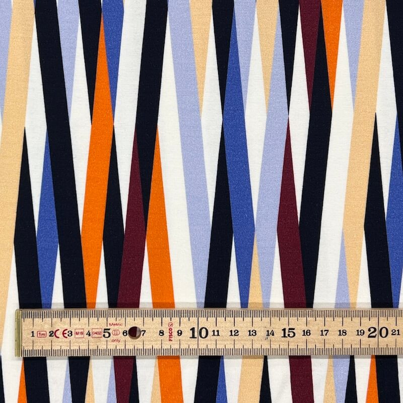 This super soft viscose jersey has beautiful coloured stripes which criss cross and overlap.