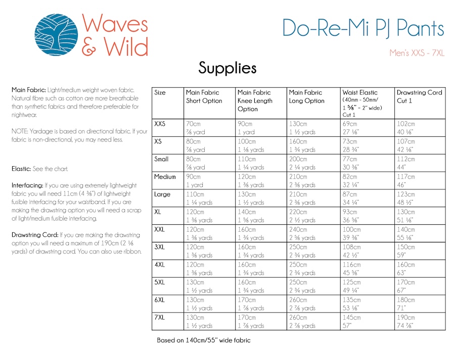 The Do-Re-Mi PJ Pants pattern is designed for light/mid-weight woven fabrics. There are three length options – full length, knee length and short.