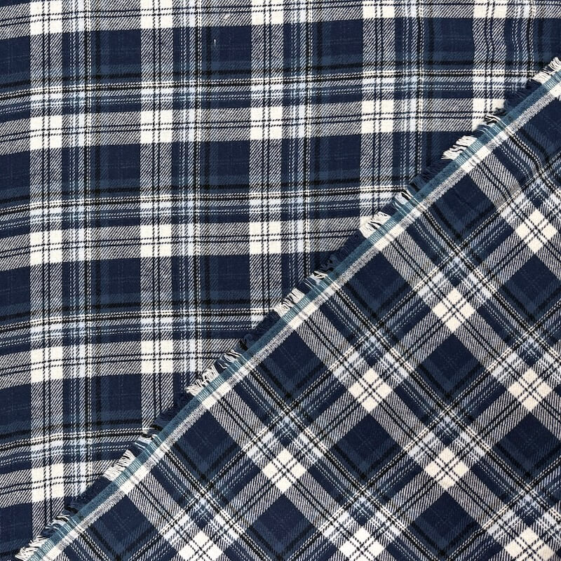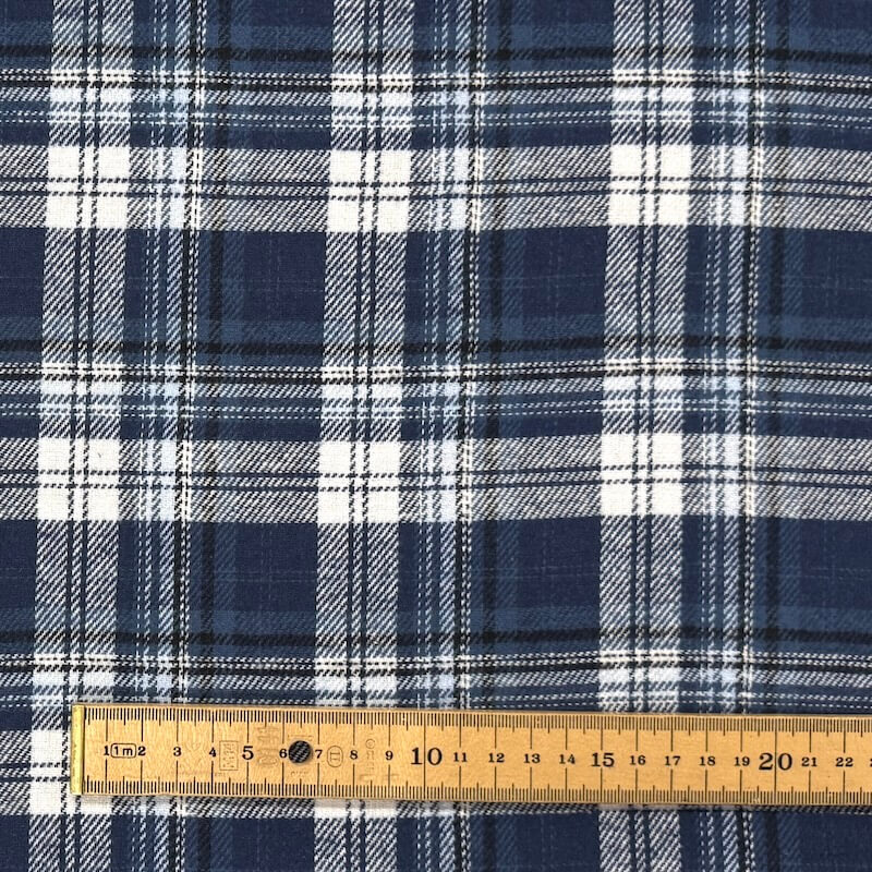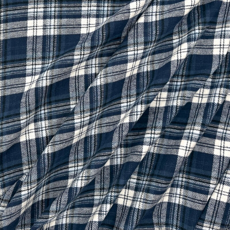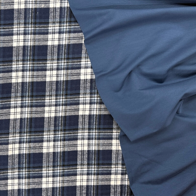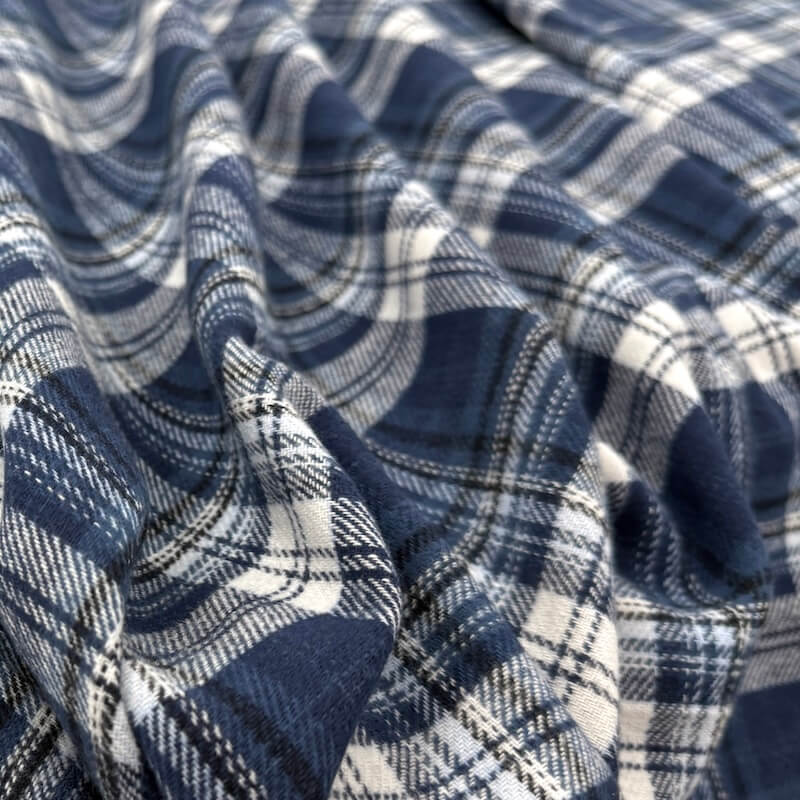A medium weigh 100% cotton fabric with a check design featuring shades of blue with white highlights. The face side of this fabric is brushed and beautifully soft to touch, perfect for staying cosy in the cooler months.